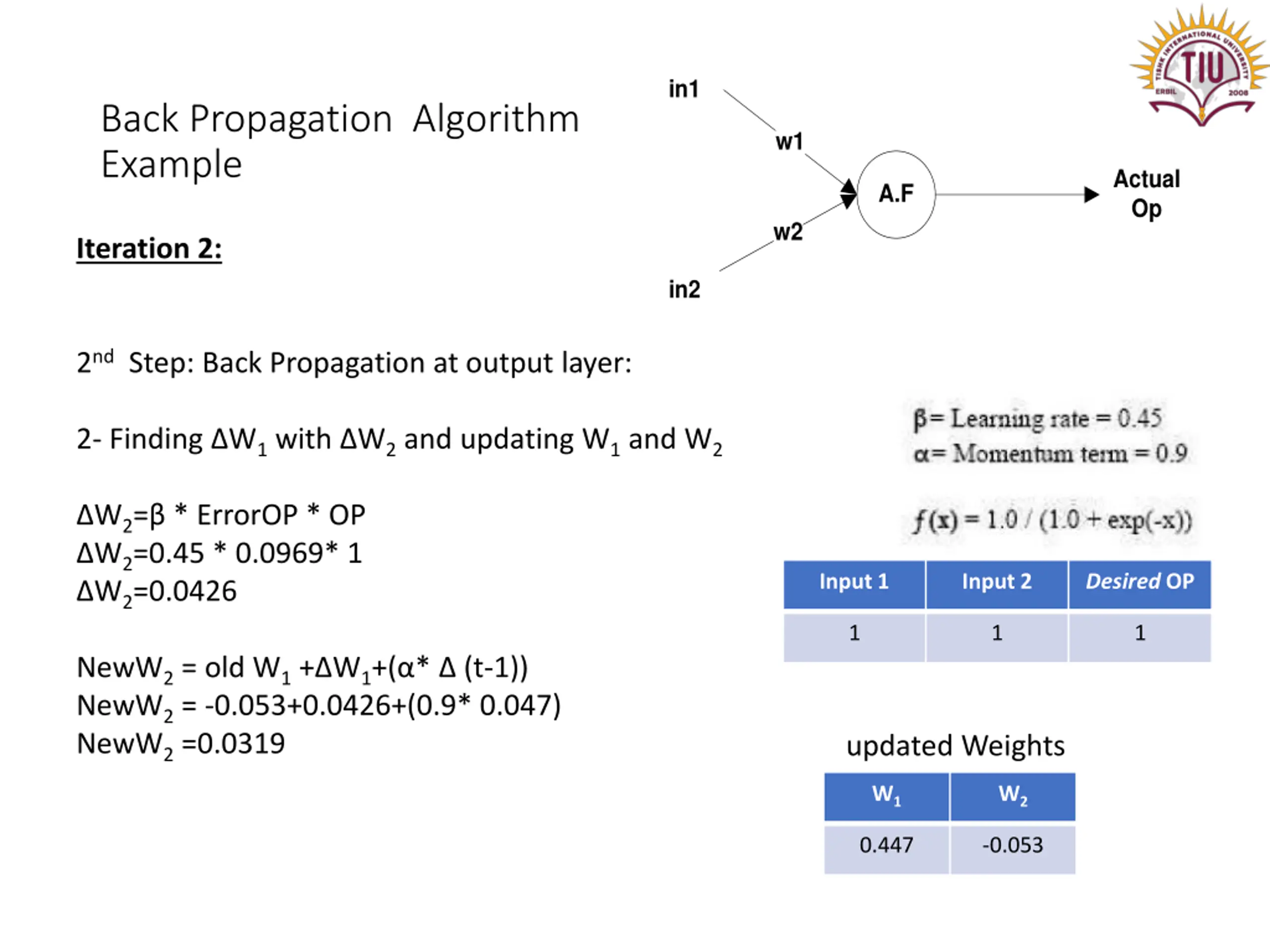 in1 Back Propagation Algorithm Example w1 Actual Op A.F w2 Iteration 2: in2 2nd Step: Back Propagation at output layer: 2- Finding W1with W2 and updating W1 and W2 W1= * ErrorOP * OP W1=0.45 * 0.0969* 1 W1=0.0426 Input 1 Input 2 Desired OP 1 1 1 NewW1 = old W1+ W1+( * (t-1)) NewW1 = 0.447+0.0426+(0.9* 0.047) NewW1 =0.5319 updated Weights W1 W2 0.447 -0.053