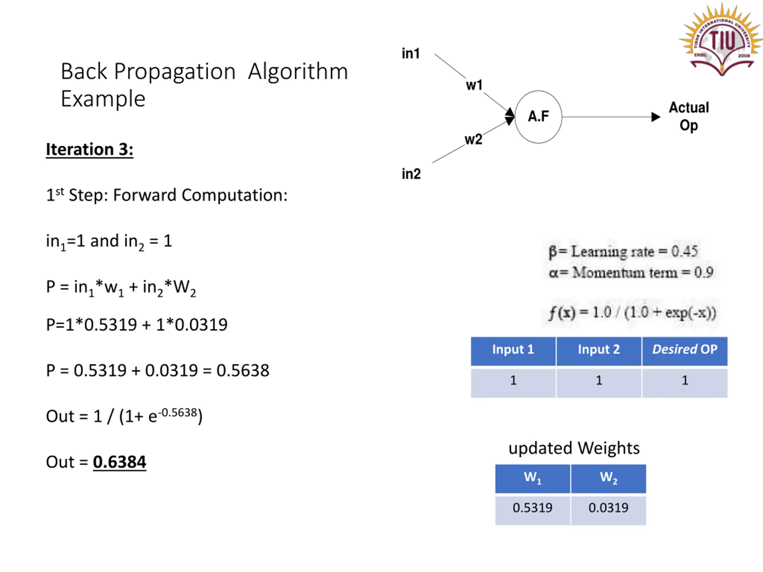 in1 Back Propagation Algorithm Example w1 Actual Op A.F w2 Iteration 3: in2 1st Step: Forward Computation: in1=1 and in2 = 1 P = in1*w1 + in2*W2 P=1*0.5319 + 1*0.0319 Input 1 Input 2 Desired OP P = 0.5319 + 0.0319 = 0.5638 1 1 1 Out = 1 / (1+ e-0.5638) updated Weights Out = 0.6384 W1 W2 0.5319 0.0319