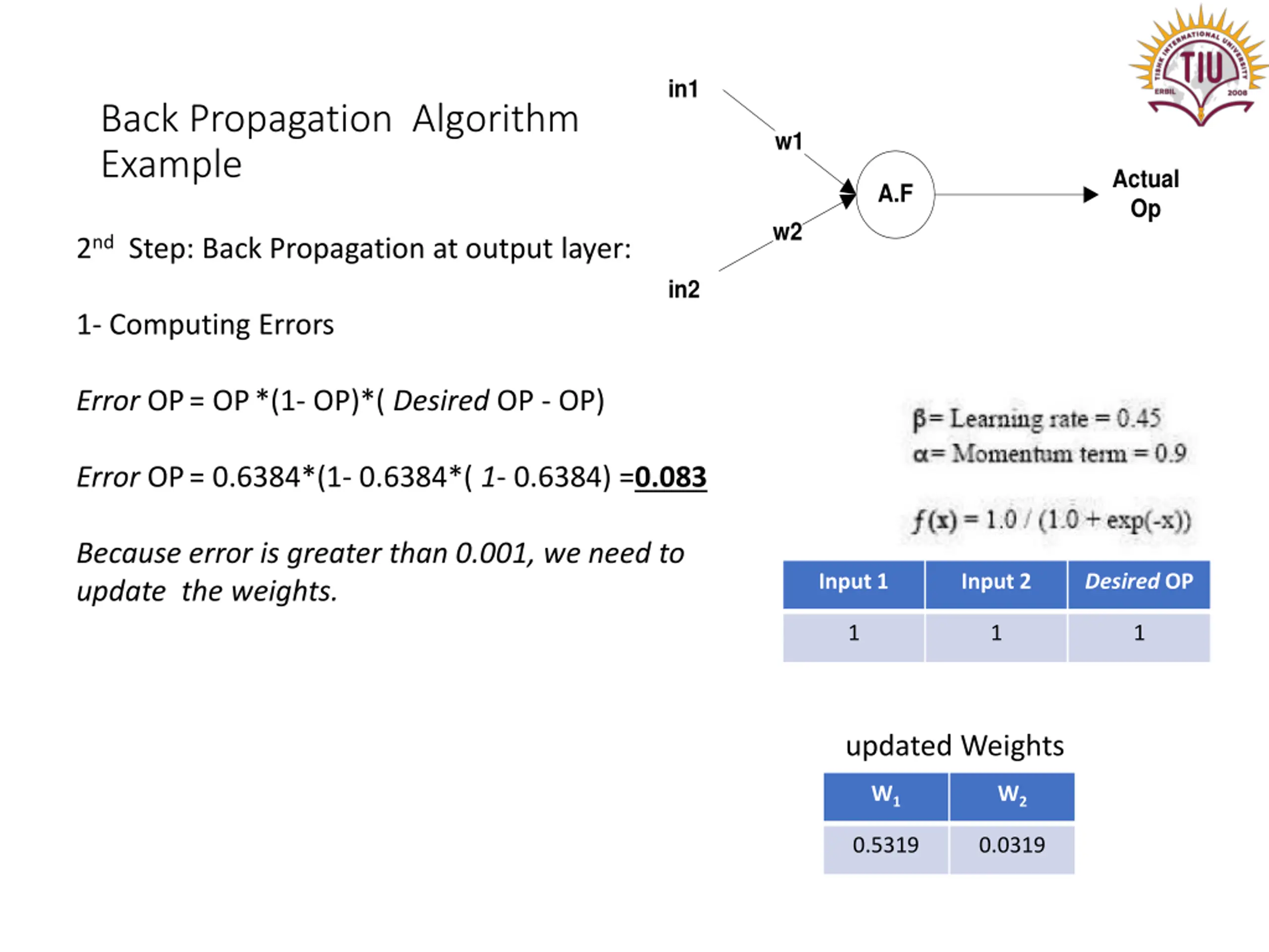 in1 Back Propagation Algorithm Example w1 Actual Op A.F w2 2nd Step: Back Propagation at output layer: in2 1- Computing Errors Error OP= OP*(1- OP)*( Desired OP - OP) Error OP= 0.6384*(1- 0.6384*( 1- 0.6384) =0.083 Because error is greater than 0.001, we need to update the weights. Input 1 Input 2 Desired OP 1 1 1 updated Weights W1 W2 0.5319 0.0319