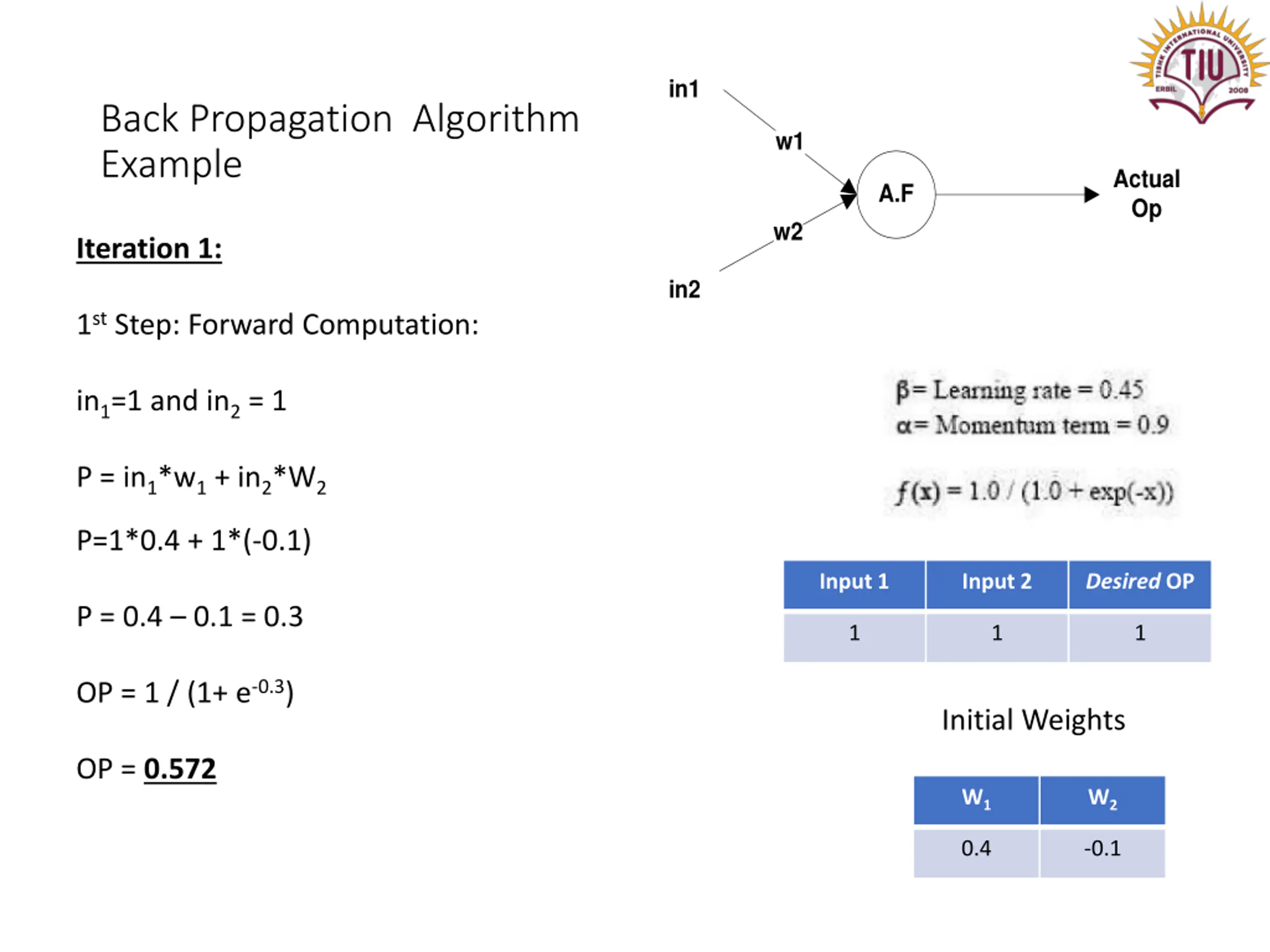 in1 Back Propagation Algorithm Example w1 Actual Op A.F w2 Iteration 1: in2 1st Step: Forward Computation: in1=1 and in2 = 1 P = in1*w1 + in2*W2 P=1*0.4 + 1*(-0.1) Input 1 Input 2 Desired OP P = 0.4 0.1 = 0.3 1 1 1 OP = 1 / (1+ e-0.3) Initial Weights OP = 0.572 W1 W2 0.4 -0.1