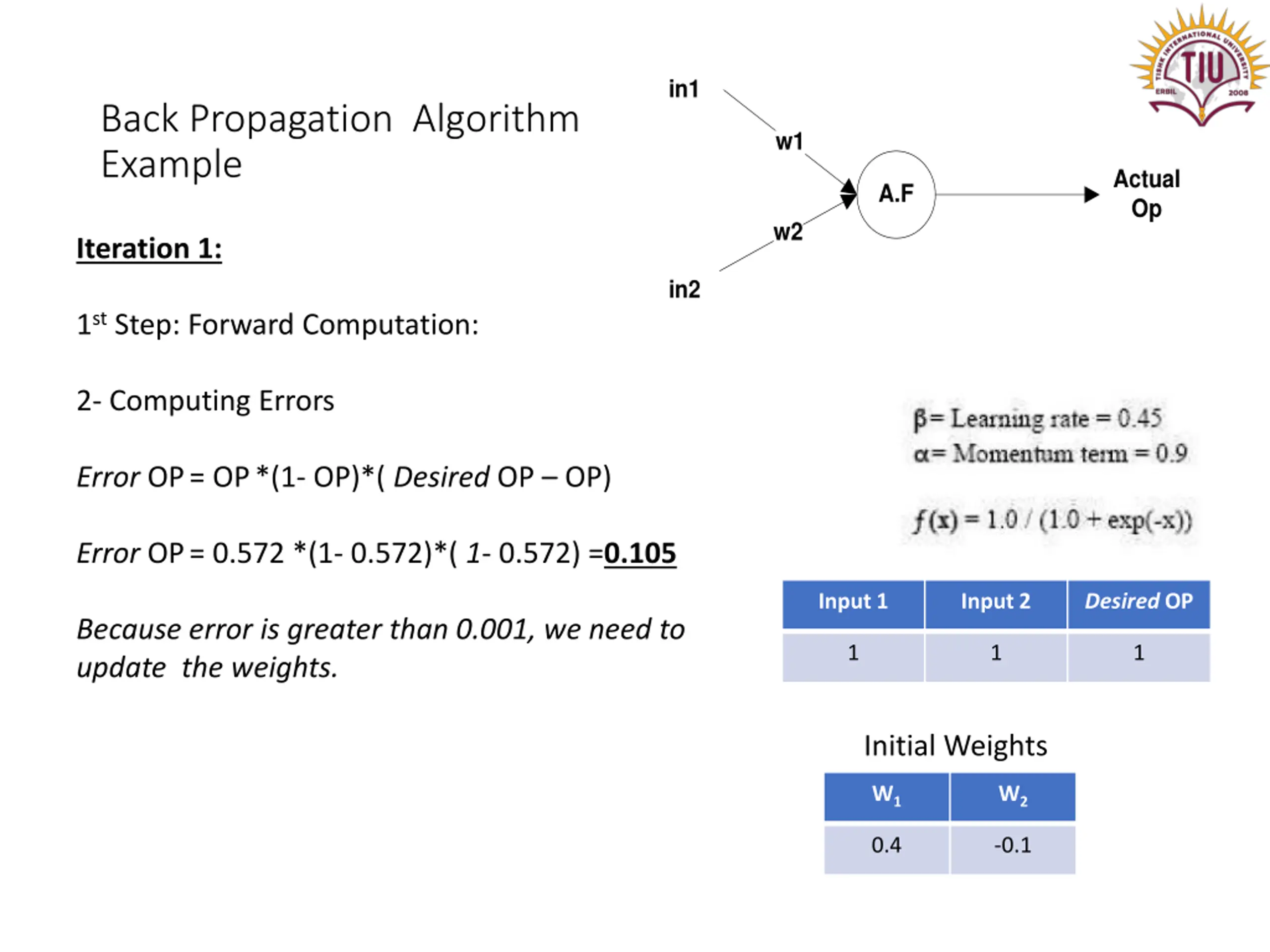 in1 Back Propagation Algorithm Example w1 Actual Op A.F w2 Iteration 1: in2 1st Step: Forward Computation: 2- Computing Errors Error OP= OP*(1- OP)*( Desired OP OP) Error OP= 0.572 *(1- 0.572)*( 1- 0.572) =0.105 Input 1 Input 2 Desired OP Because error is greater than 0.001, we need to update the weights. 1 1 1 Initial Weights W1 W2 0.4 -0.1