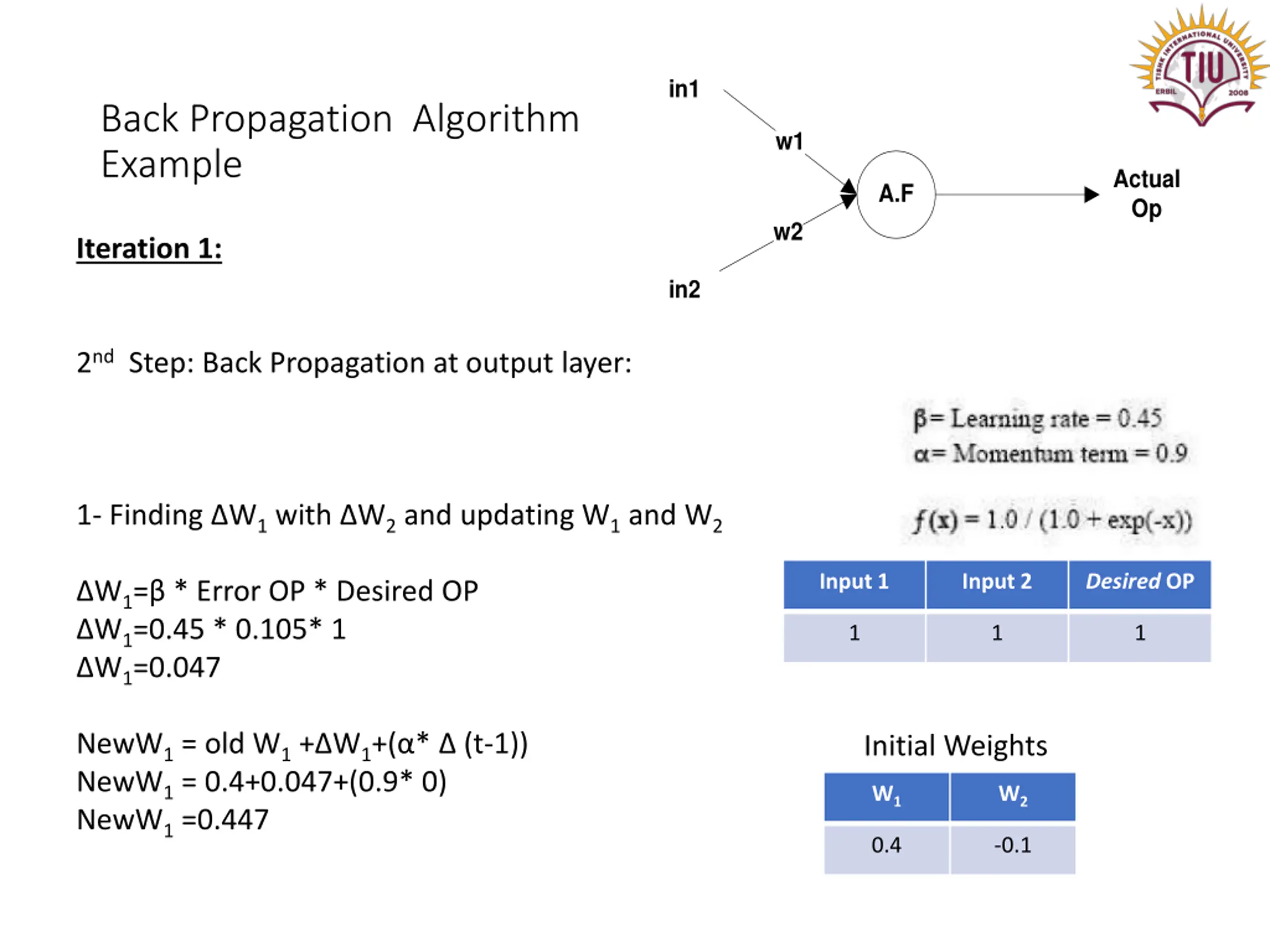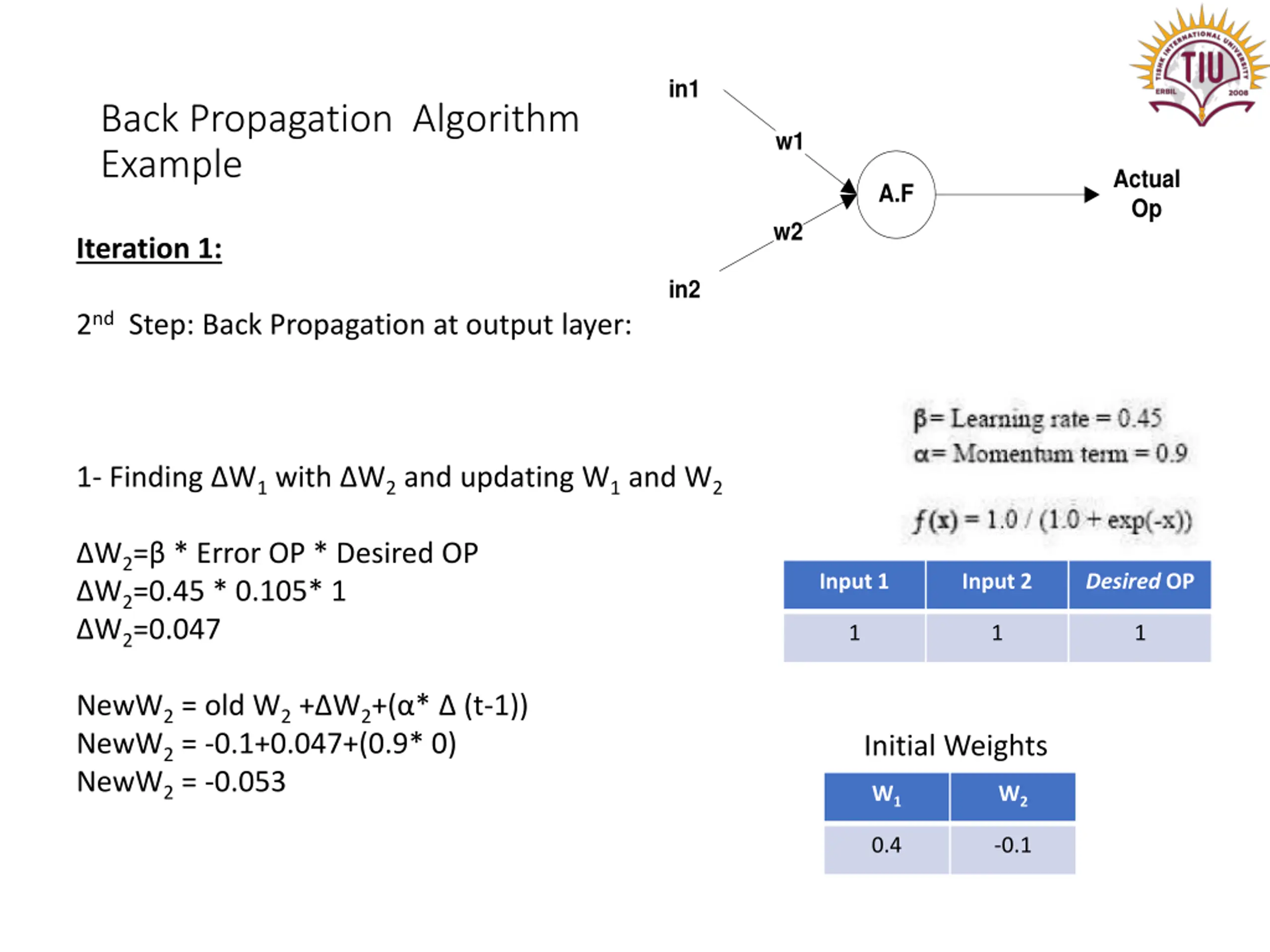 in1 Back Propagation Algorithm Example w1 Actual Op A.F w2 Iteration 1: in2 2nd Step: Back Propagation at output layer: 1- Finding W1with W2 and updating W1 and W2 W2= * Error OP * Desired OP W2=0.45 * 0.105* 1 W2=0.047 Input 1 Input 2 Desired OP 1 1 1 NewW2 = old W2+ W2+( * (t-1)) NewW2 = -0.1+0.047+(0.9* 0) NewW2 = -0.053 Initial Weights W1 W2 0.4 -0.1