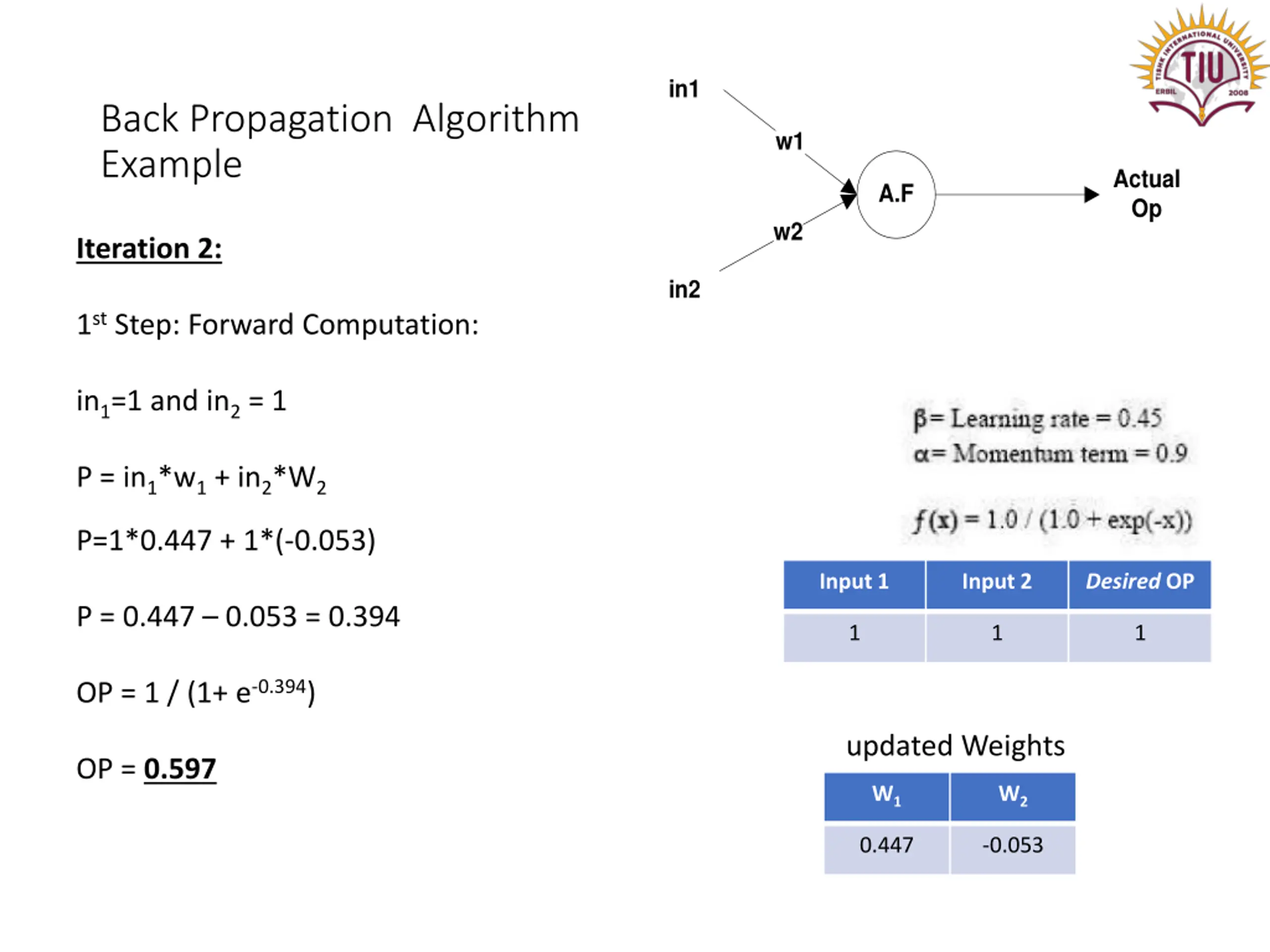 in1 Back Propagation Algorithm Example w1 Actual Op A.F w2 Iteration 2: in2 1st Step: Forward Computation: in1=1 and in2 = 1 P = in1*w1 + in2*W2 P=1*0.447 + 1*(-0.053) Input 1 Input 2 Desired OP P = 0.447 0.053 = 0.394 1 1 1 OP = 1 / (1+ e-0.394) updated Weights OP = 0.597 W1 W2 0.447 -0.053