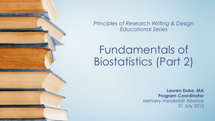 Principles of Research Writing & Design Educational Series Fundamentals of Biostatistics (Part 2) Lauren Duke, MA Program Coordinator Meharry-Vanderbilt Alliance 31 July 2015