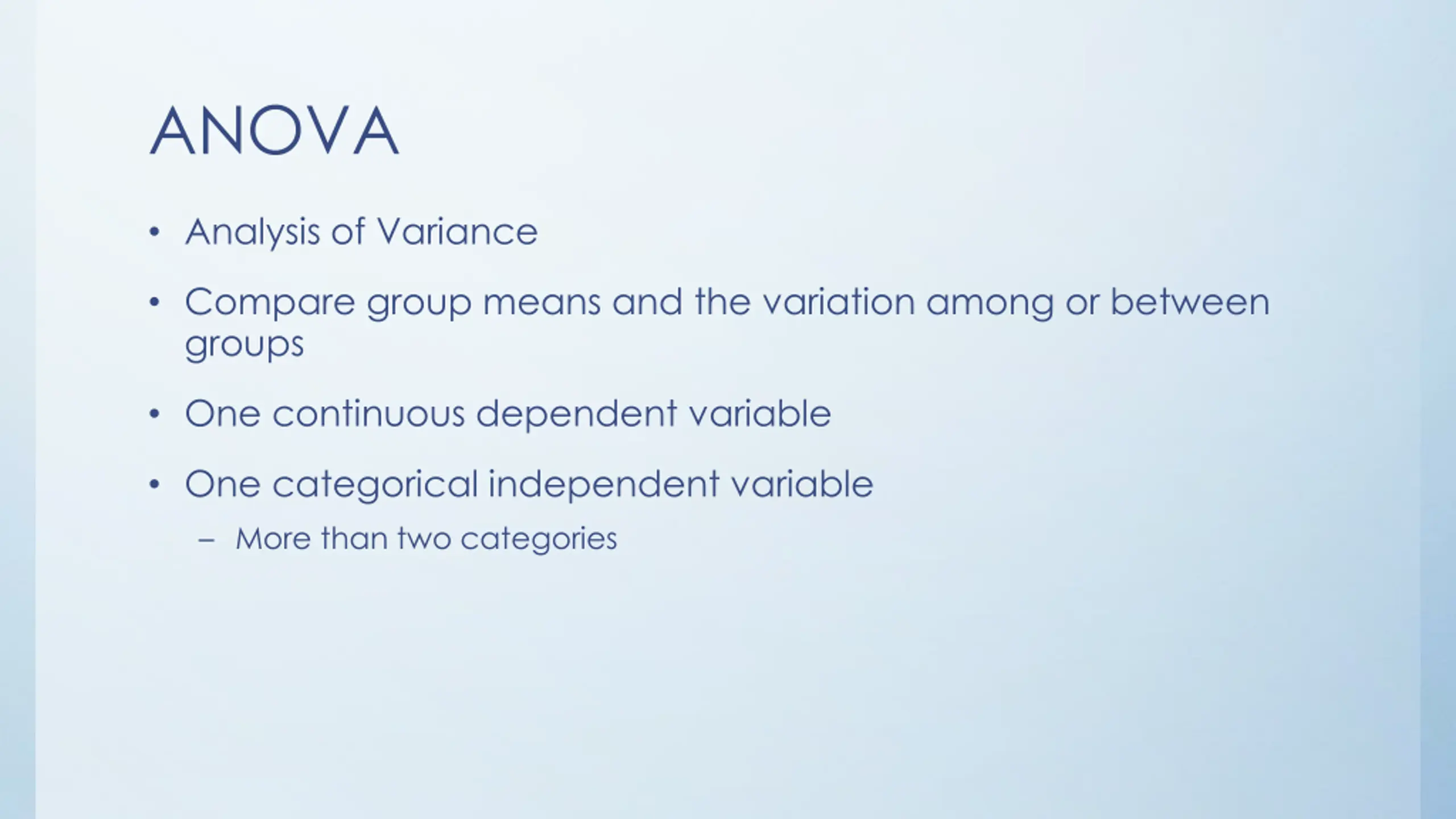 ANOVA Analysis of Variance Compare group means and the variation among or between groups One continuous dependent variable One categorical independent variable More than two categories