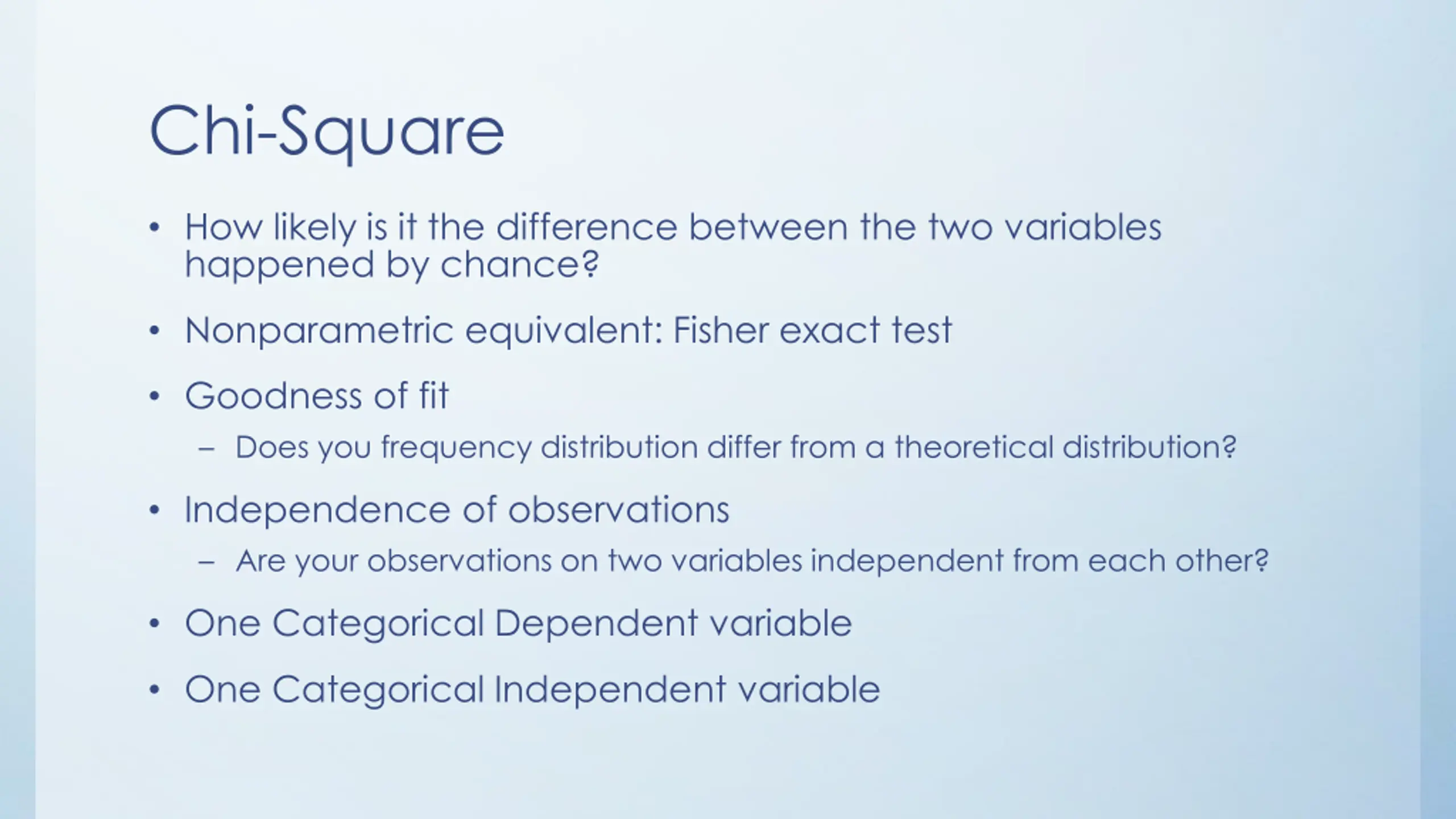 Chi-Square How likely is it the difference between the two variables happened by chance? Nonparametric equivalent: Fisher exact test Goodness of fit Does you frequency distribution differ from a theoretical distribution? Independence of observations Are your observations on two variables independent from each other? One Categorical Dependent variable One Categorical Independent variable