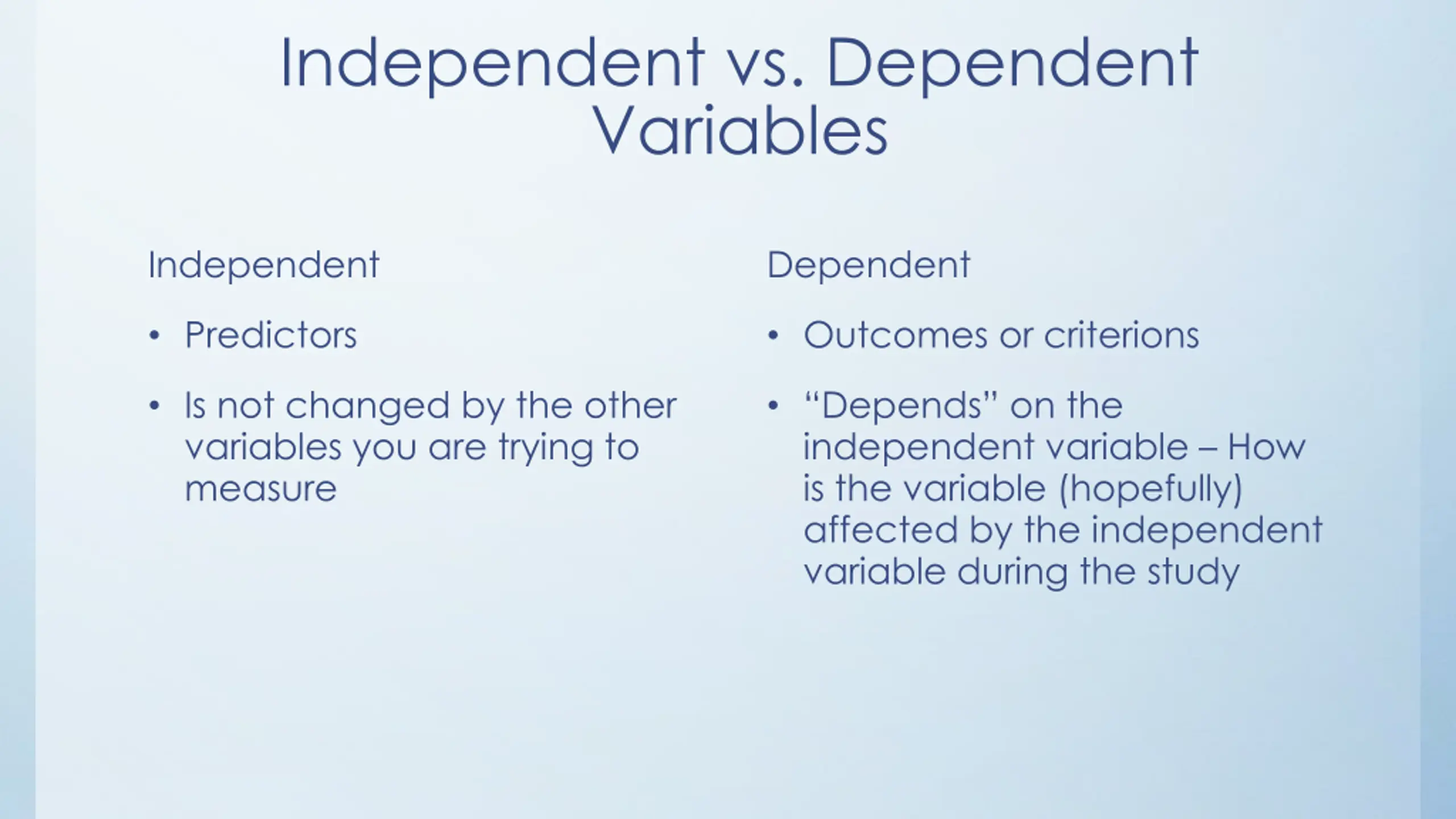 Independent vs. Dependent Variables Independent Dependent Predictors Outcomes or criterions Is not changed by the other variables you are trying to measure Depends on the independent variable How is the variable (hopefully) affected by the independent variable during the study