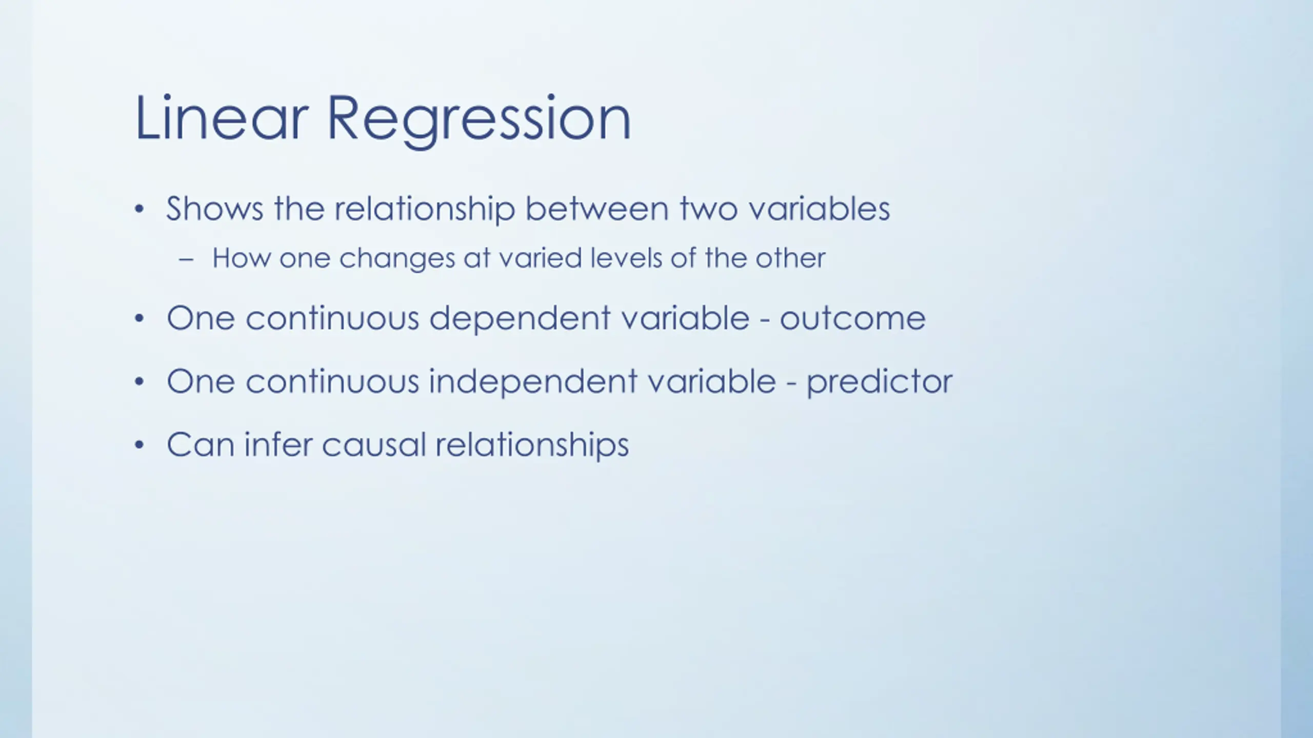 Linear Regression Shows the relationship between two variables How one changes at varied levels of the other One continuous dependent variable - outcome One continuous independent variable - predictor Can infer causal relationships