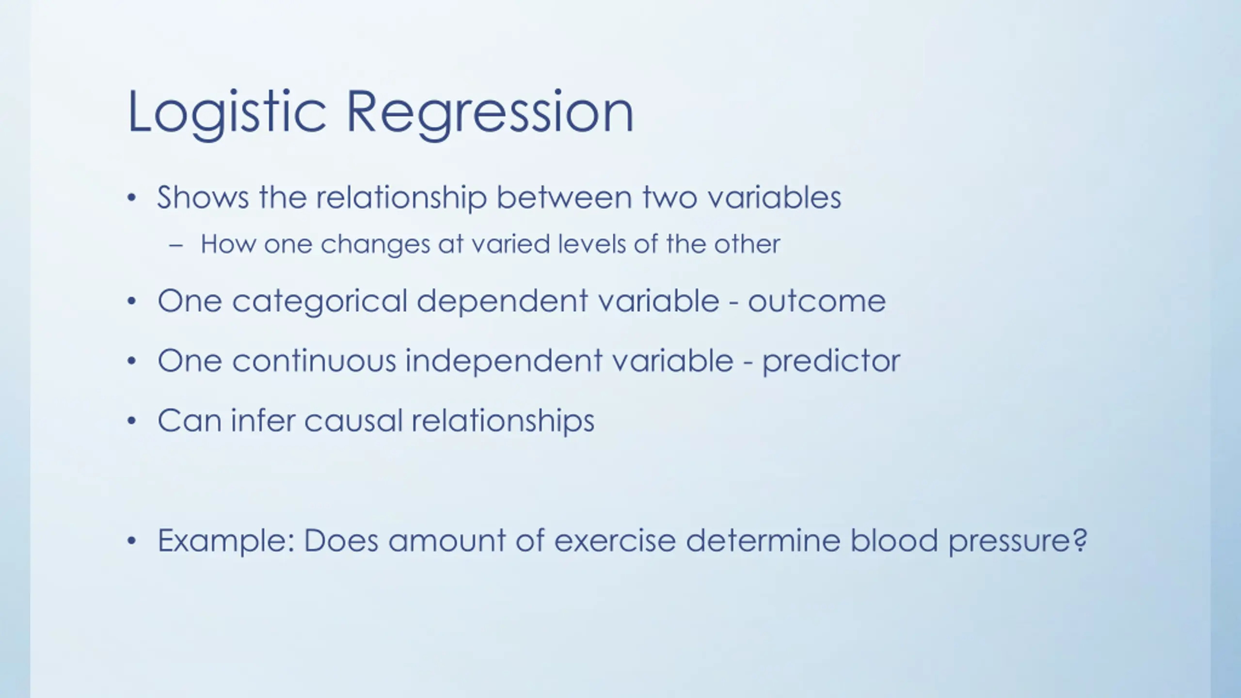 Logistic Regression Shows the relationship between two variables How one changes at varied levels of the other One categorical dependent variable - outcome One continuous independent variable - predictor Can infer causal relationships Example: Does amount of exercise determine blood pressure?