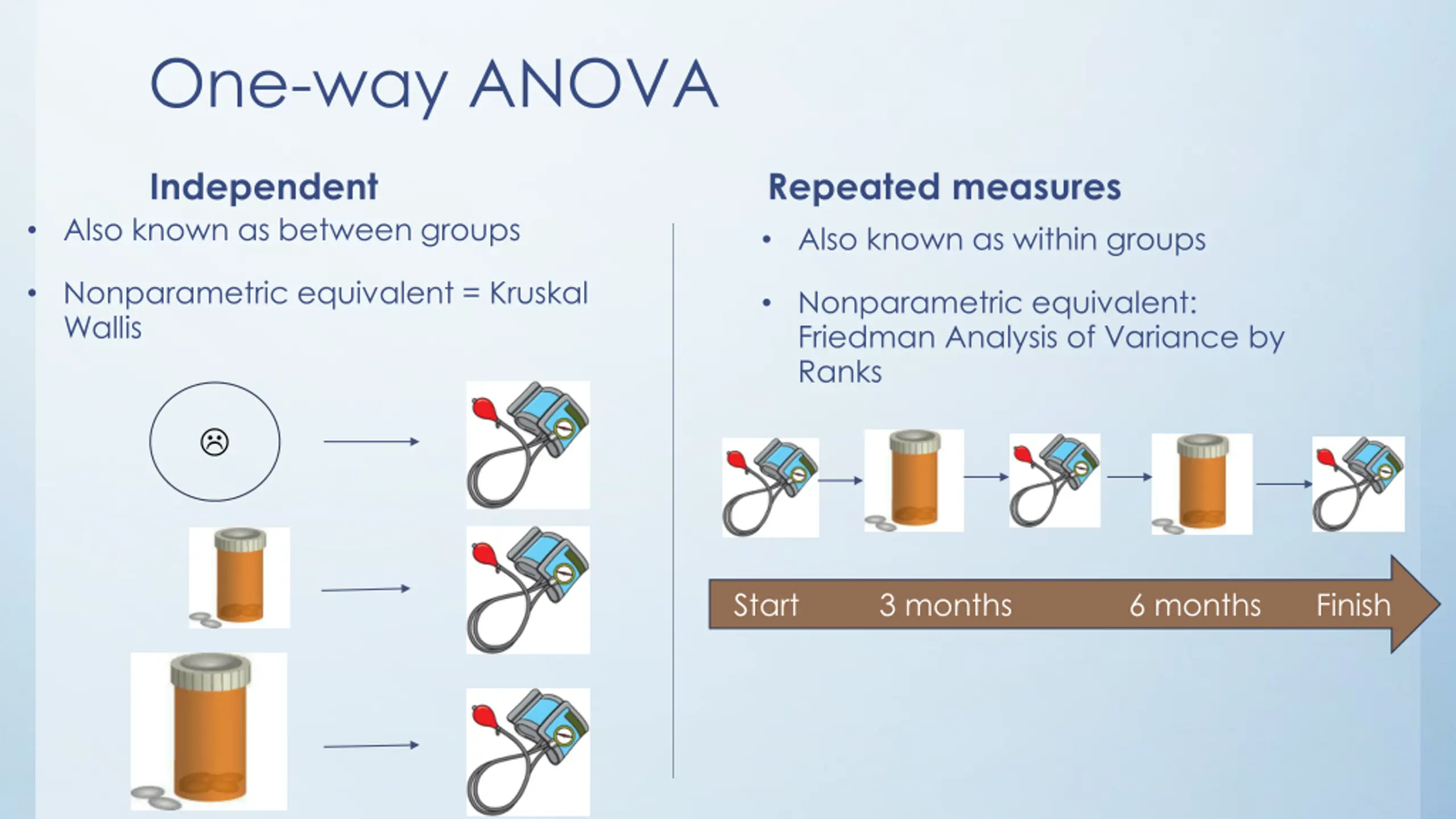 One-way ANOVA Independent Repeated measures Also known as within groups Also known as between groups Nonparametric equivalent = Kruskal Wallis Nonparametric equivalent: Friedman Analysis of Variance by Ranks Start 3 months 6 months Finish