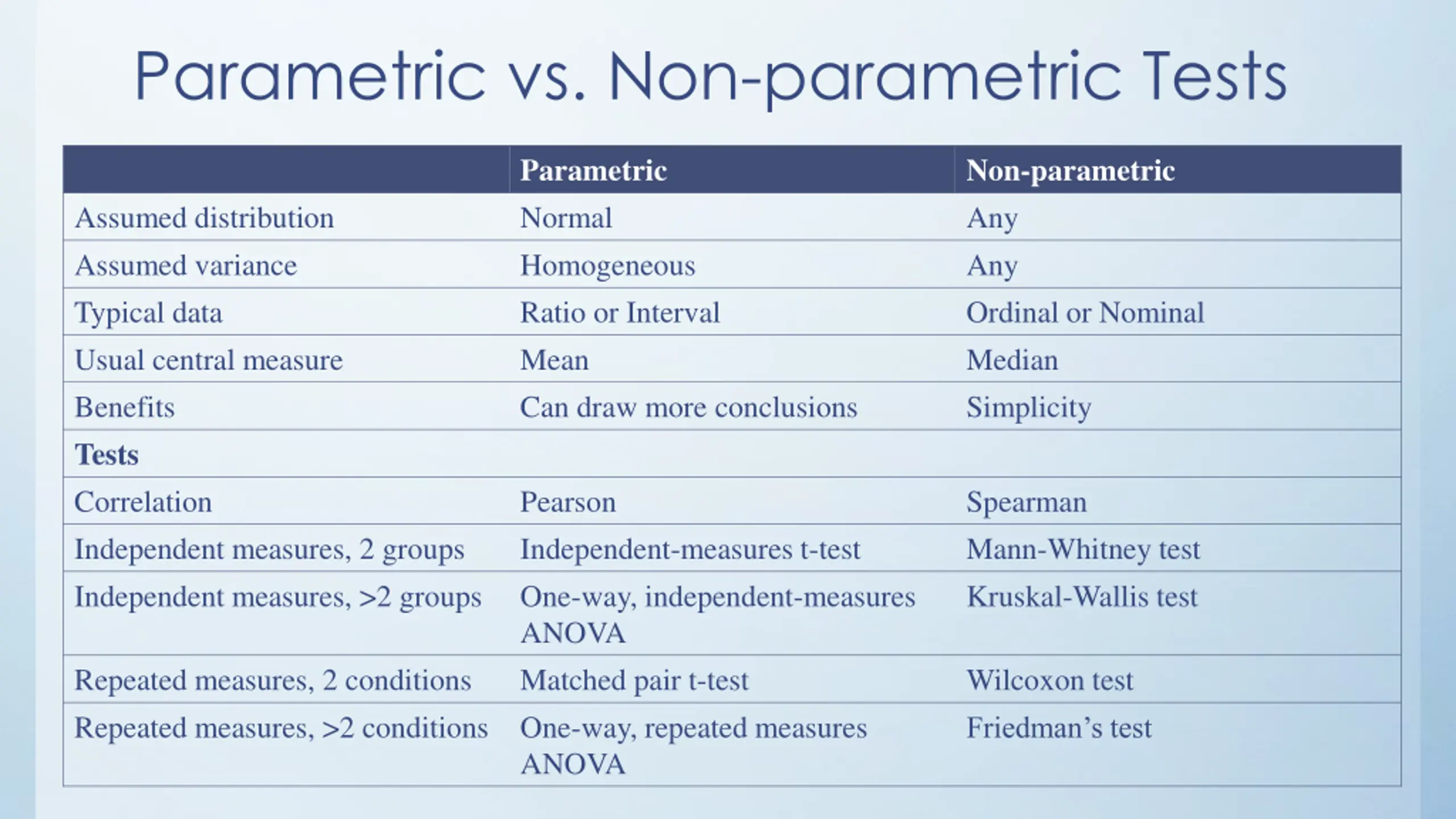 Parametric vs. Non-parametric Tests Parametric Normal Homogeneous Ratio or Interval Mean Can draw more conclusions Non-parametric Any Any Ordinal or Nominal Median Simplicity Assumed distribution Assumed variance Typical data Usual central measure Benefits Tests Correlation Independent measures, 2 groups Independent measures, >2 groups Pearson Independent-measures t-test One-way, independent-measures ANOVA Matched pair t-test One-way, repeated measures ANOVA Spearman Mann-Whitney test Kruskal-Wallis test Repeated measures, 2 conditions Repeated measures, >2 conditions Wilcoxon test Friedman s test