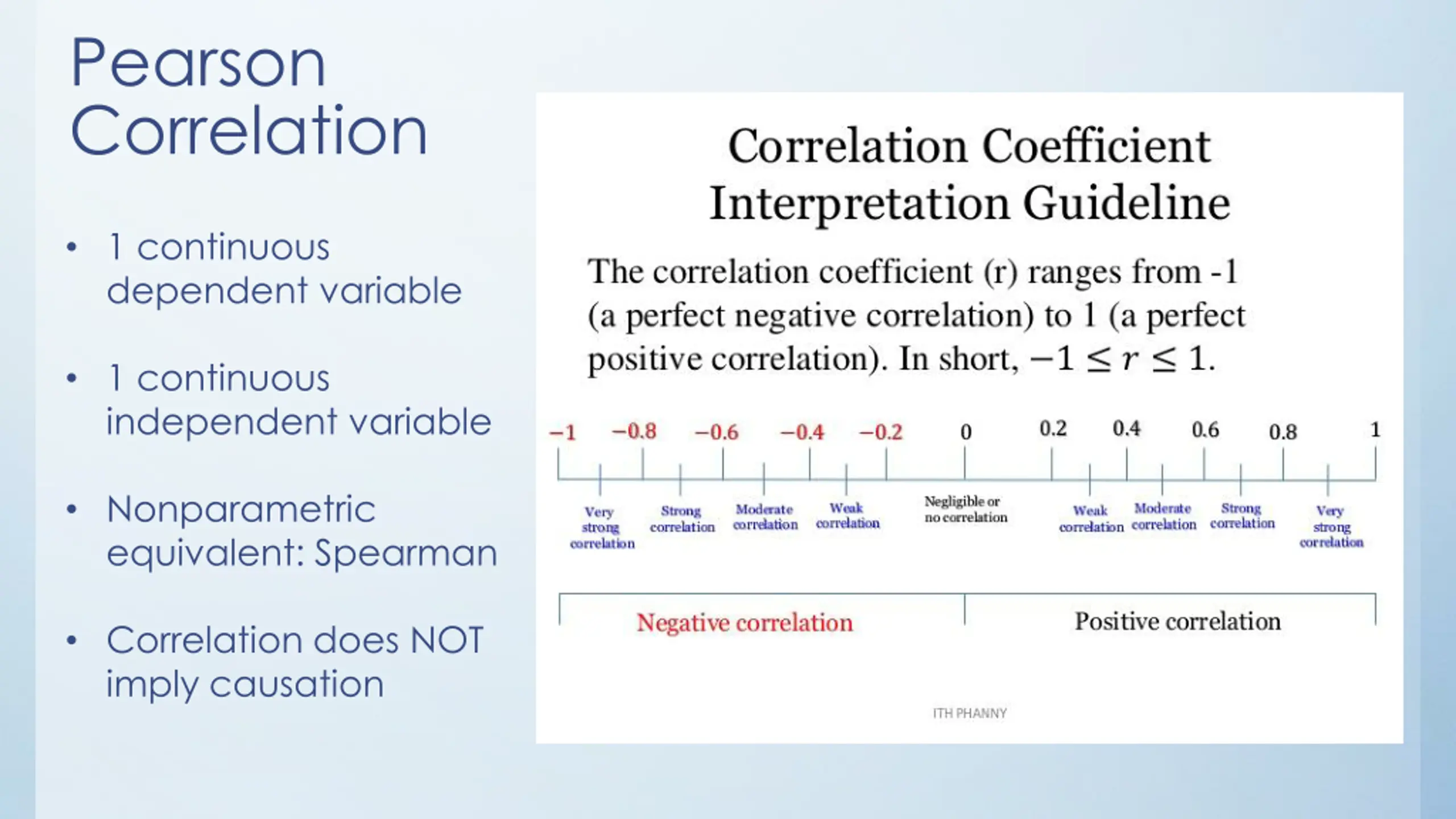 Pearson Correlation 1 continuous dependent variable 1 continuous independent variable Nonparametric equivalent: Spearman Correlation does NOT imply causation