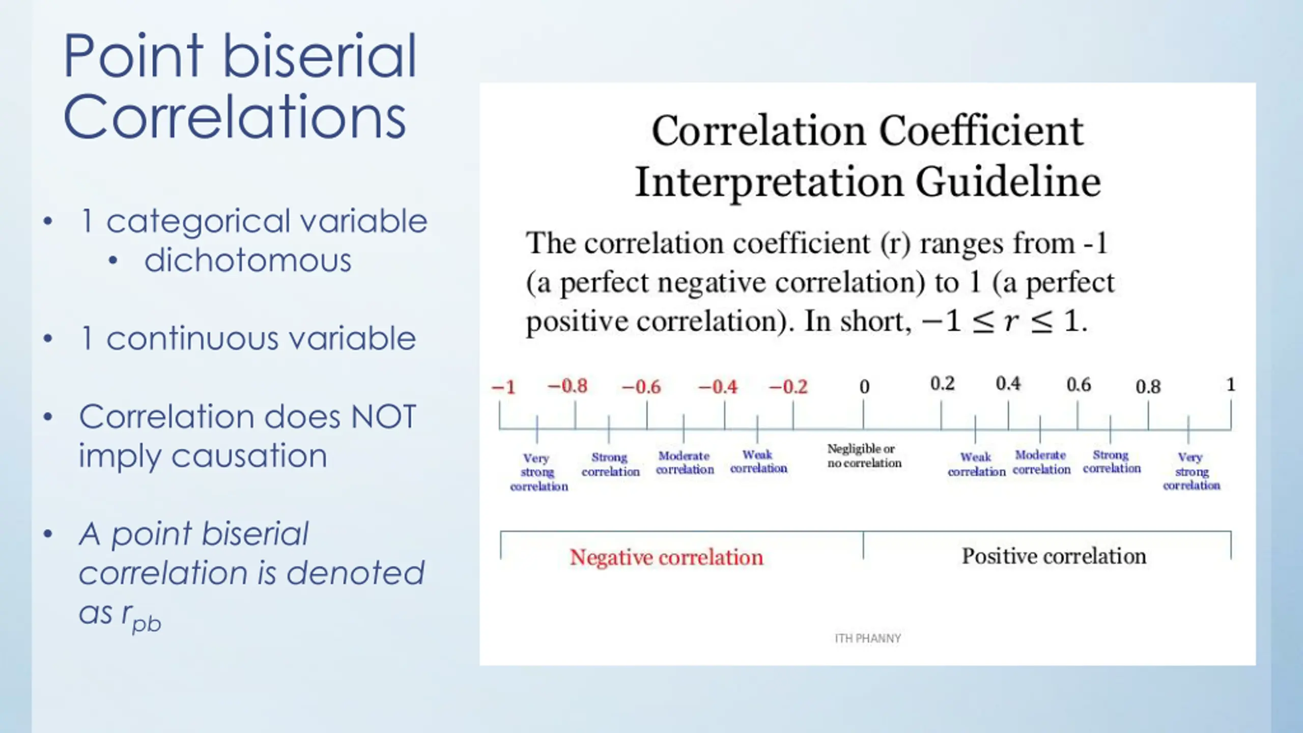 Point biserial Correlations 1 categorical variable dichotomous 1 continuous variable Correlation does NOT imply causation A point biserial correlation is denoted as rpb