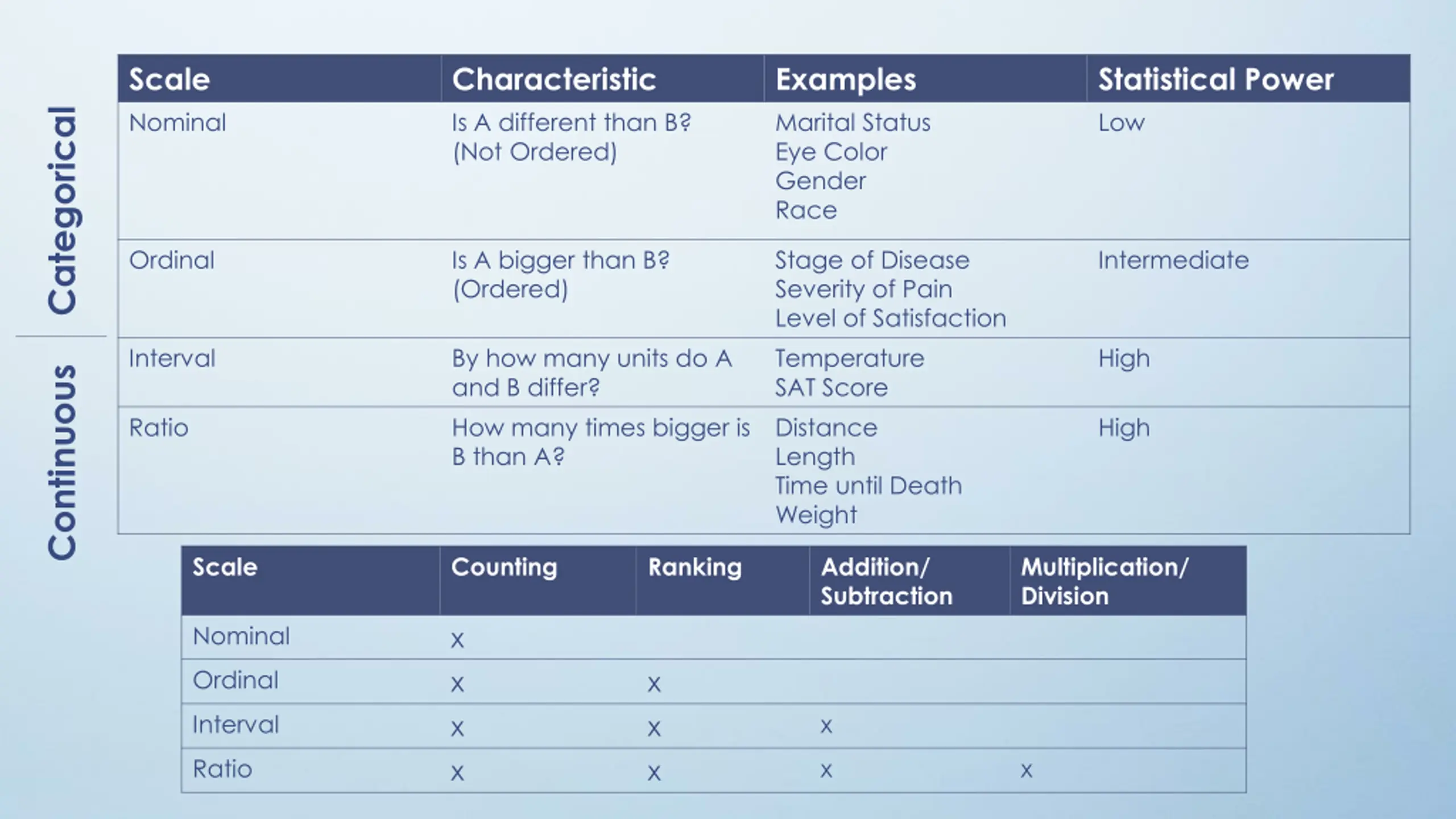 Scale Nominal Characteristic Is A different than B? (Not Ordered) Examples Marital Status Eye Color Gender Race Statistical Power Low Categorical Ordinal Is A bigger than B? (Ordered) Stage of Disease Severity of Pain Level of Satisfaction Temperature SAT Score Distance Length Time until Death Weight Intermediate Interval By how many units do A and B differ? How many times bigger is B than A? High Continuous Ratio High Scale Counting Ranking Addition/ Subtraction Multiplication/ Division x x x x Nominal x x x Ordinal Interval x Ratio x x