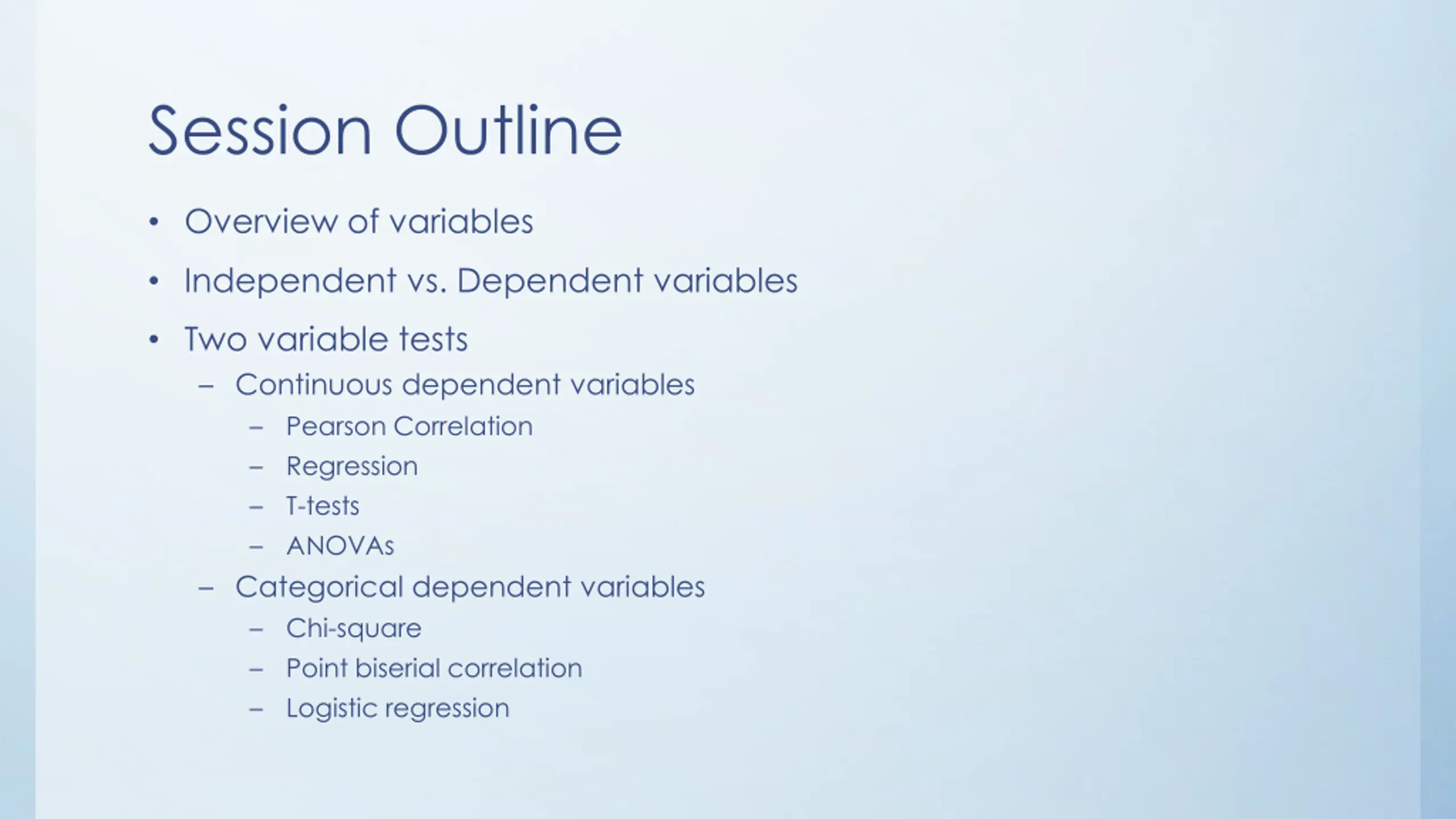 Session Outline Overview of variables Independent vs. Dependent variables Two variable tests Continuous dependent variables Pearson Correlation Regression T-tests ANOVAs Categorical dependent variables Chi-square Point biserial correlation Logistic regression