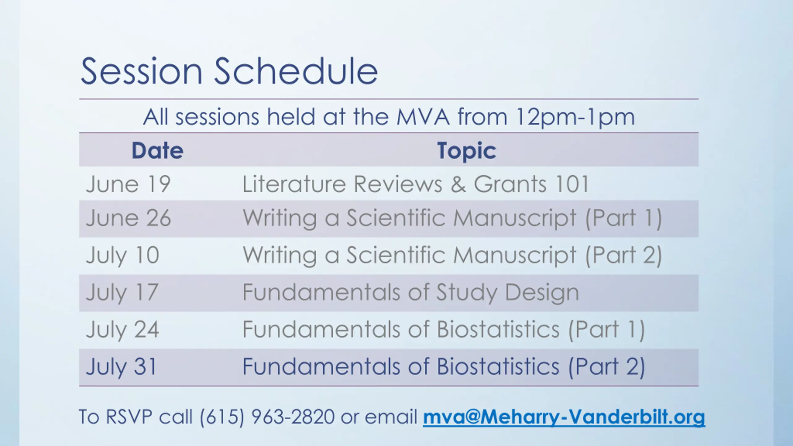 Session Schedule All sessions held at the MVA from 12pm-1pm Date June 19 Literature Reviews & Grants 101 June 26 Writing a Scientific Manuscript (Part 1) July 10 Writing a Scientific Manuscript (Part 2) July 17 Fundamentals of Study Design July 24 Fundamentals of Biostatistics (Part 1) July 31 Fundamentals of Biostatistics (Part 2) Topic To RSVP call (615) 963-2820 or email mva@Meharry-Vanderbilt.org