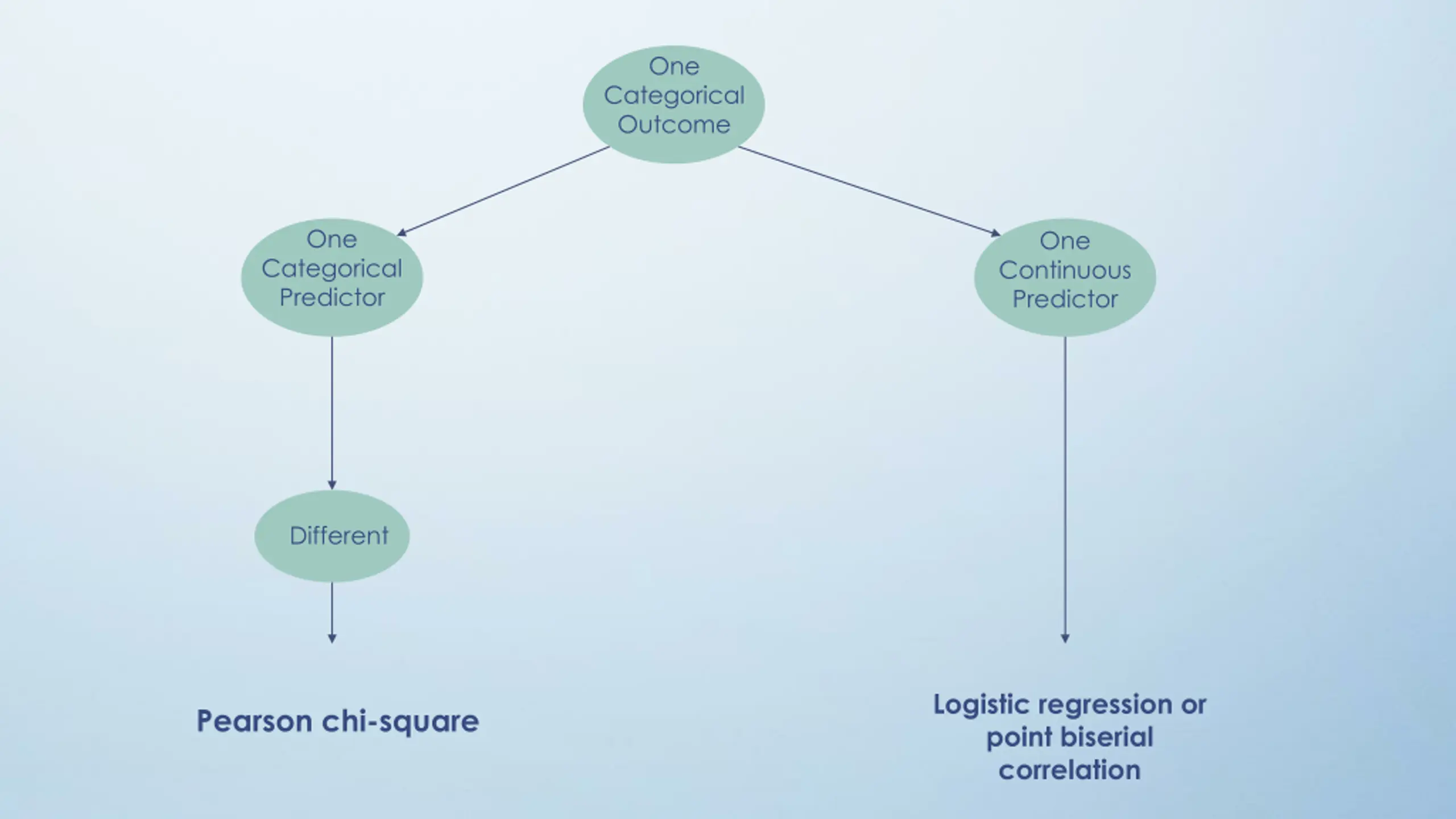 One Categorical Outcome One One Categorical Predictor Continuous Predictor Different Logistic regression or point biserial correlation Pearson chi-square