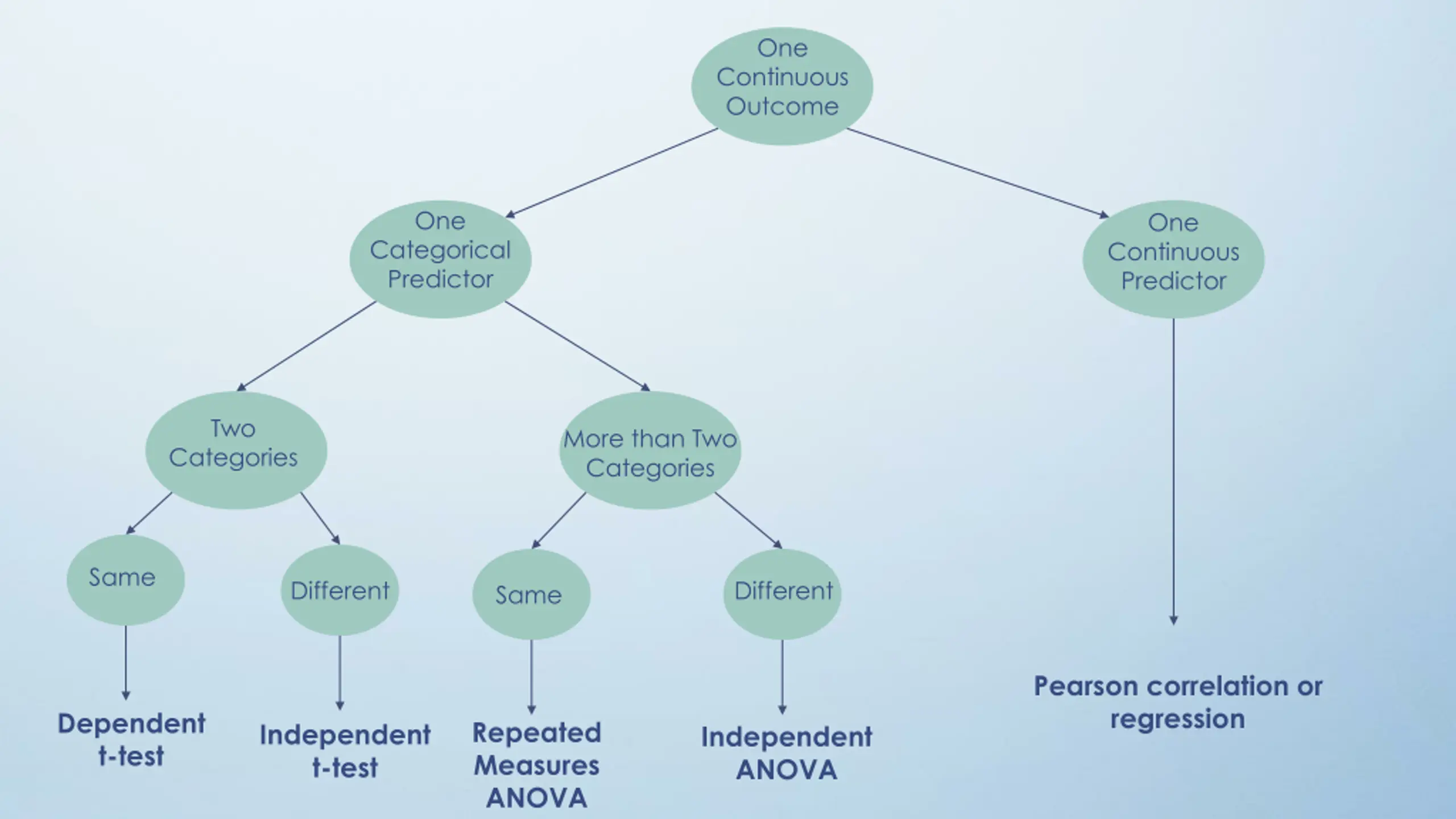 One Continuous Outcome One One Categorical Predictor Continuous Predictor Two More than Two Categories Categories Same Different Different Same Pearson correlation or regression Dependent t-test Repeated Measures ANOVA Independent t-test Independent ANOVA