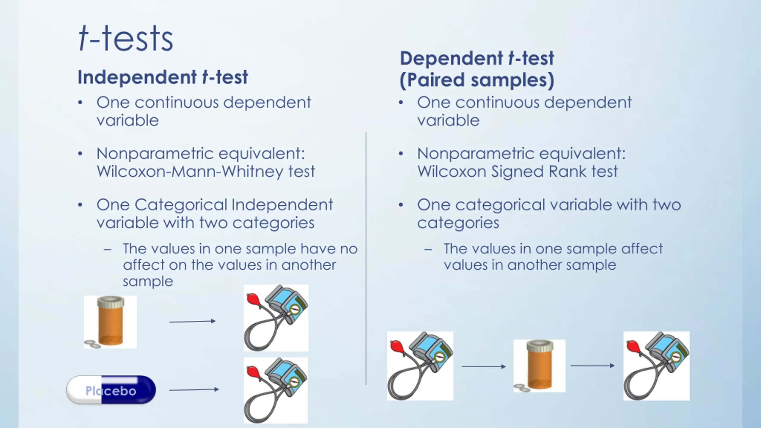 t-tests Independent t-test One continuous dependent variable Dependent t-test (Paired samples) One continuous dependent variable Nonparametric equivalent: Wilcoxon-Mann-Whitney test Nonparametric equivalent: Wilcoxon Signed Rank test One Categorical Independent variable with two categories One categorical variable with two categories The values in one sample have no affect on the values in another sample The values in one sample affect values in another sample Placebo
