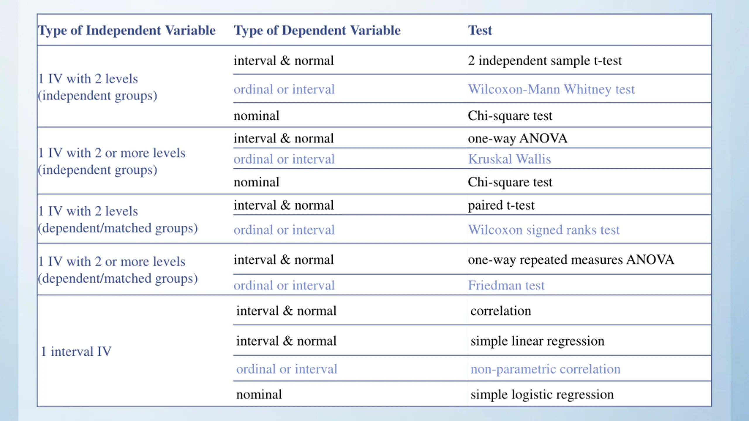 Type of Independent Variable Type of Dependent Variable Test interval & normal 2 independent sample t-test 1 IV with 2 levels (independent groups) ordinal or interval Wilcoxon-Mann Whitney test nominal interval & normal ordinal or interval Chi-square test one-way ANOVA Kruskal Wallis 1 IV with 2 or more levels (independent groups) nominal Chi-square test interval & normal paired t-test 1 IV with 2 levels (dependent/matched groups) ordinal or interval Wilcoxon signed ranks test interval & normal one-way repeated measures ANOVA 1 IV with 2 or more levels (dependent/matched groups) ordinal or interval Friedman test interval & normal correlation interval & normal simple linear regression 1 interval IV ordinal or interval non-parametric correlation nominal simple logistic regression