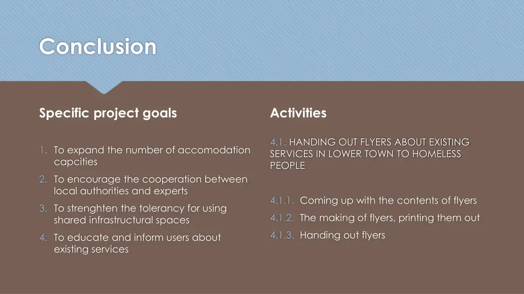 Conclusion Specific project goals Activities 4.1. HANDING OUT FLYERS ABOUT EXISTING SERVICES IN LOWER TOWN TO HOMELESS PEOPLE 1. To expand the number of accomodation capcities 2. To encourage the cooperation between local authorities and experts 4.1.1. Coming up with the contents of flyers 3. To strenghten the tolerancy for using shared infrastructural spaces 4.1.2. The making of flyers, printing them out 4.1.3. Handing out flyers 4. To educate and inform users about existing services