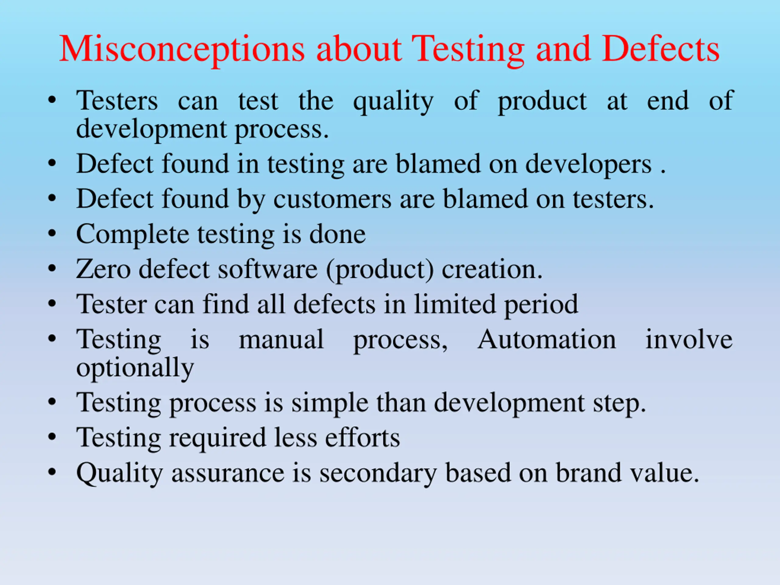 Misconceptions about Testing and Defects Testers can test the quality of product at end of development process. Defect found in testing are blamed on developers . Defect found by customers are blamed on testers. Complete testing is done Zero defect software (product) creation. Tester can find all defects in limited period Testing is manual process, Automation involve optionally Testing process is simple than development step. Testing required less efforts Quality assurance is secondary based on brand value.