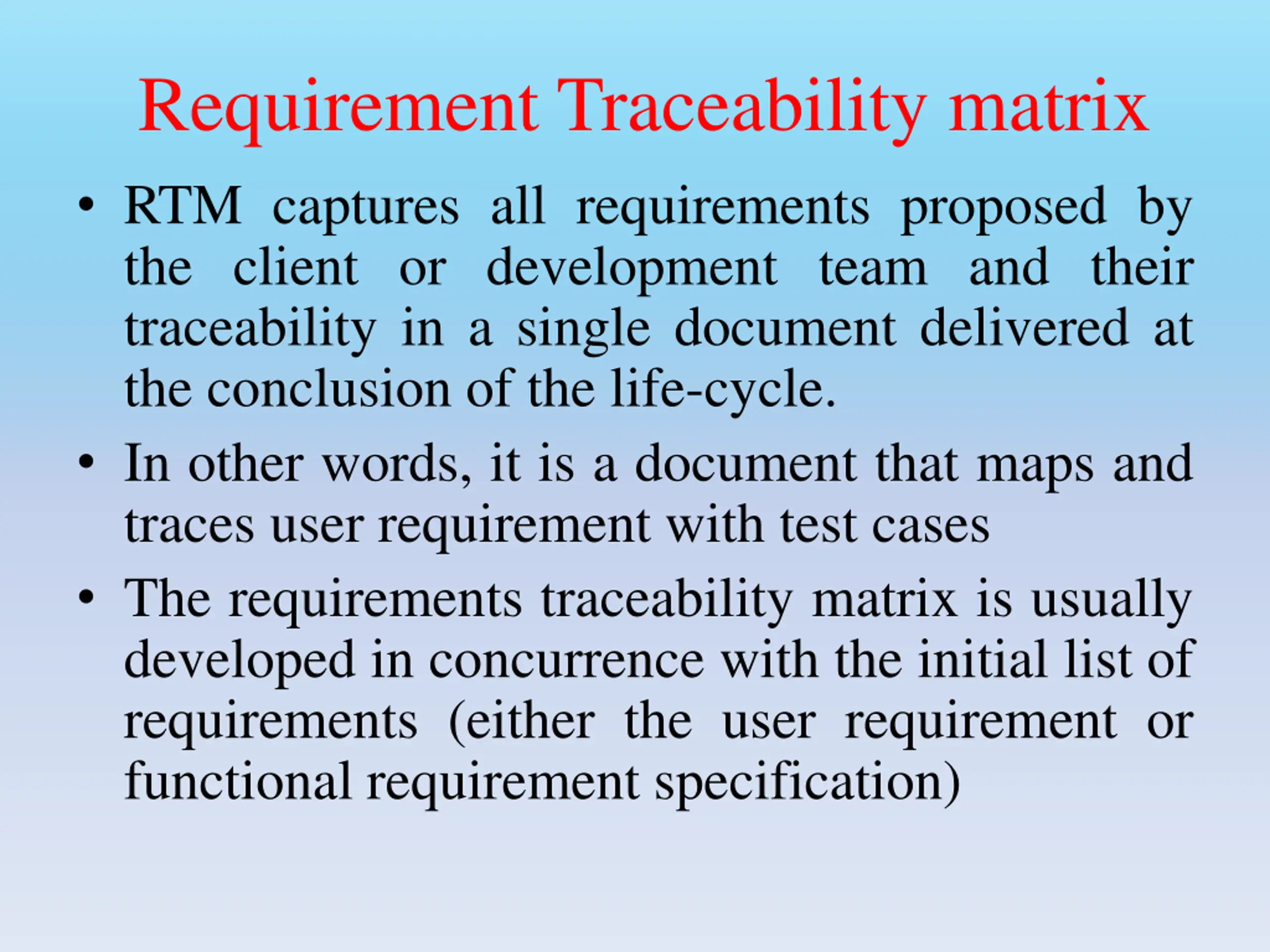 Requirement Traceability matrix RTM captures all requirements proposed by the client or development team and their traceability in a single document delivered at the conclusion of the life-cycle. In other words, it is a document that maps and traces user requirement with test cases The requirements traceability matrix is usually developed in concurrence with the initial list of requirements (either the user requirement or functional requirement specification)