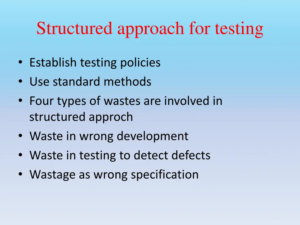 Structured approach for testing Establish testing policies Use standard methods Four types of wastes are involved in structured approch Waste in wrong development Waste in testing to detect defects Wastage as wrong specification