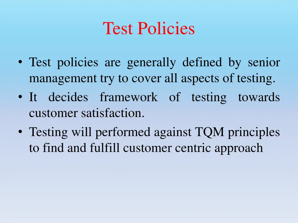 Test Policies Test policies are generally defined by senior management try to cover all aspects of testing. It decides framework of testing towards customer satisfaction. Testing will performed against TQM principles to find and fulfill customer centric approach