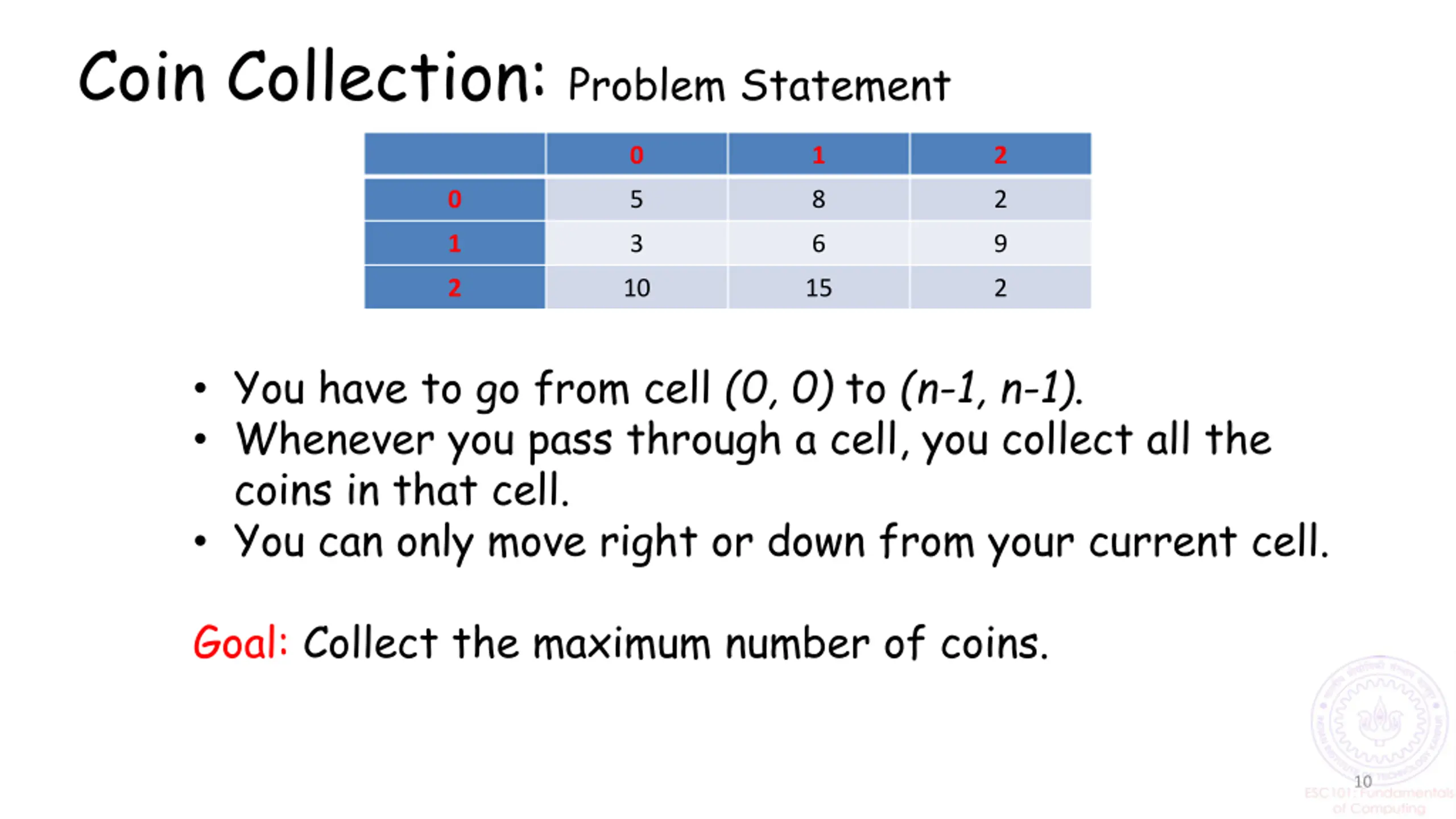 Coin Collection: Problem Statement 0 1 2 0 5 8 2 1 3 6 9 2 10 15 2 You have to go from cell (0, 0) to (n-1, n-1). Whenever you pass through a cell, you collect all the coins in that cell. You can only move right or down from your current cell. Goal: Collect the maximum number of coins. 10