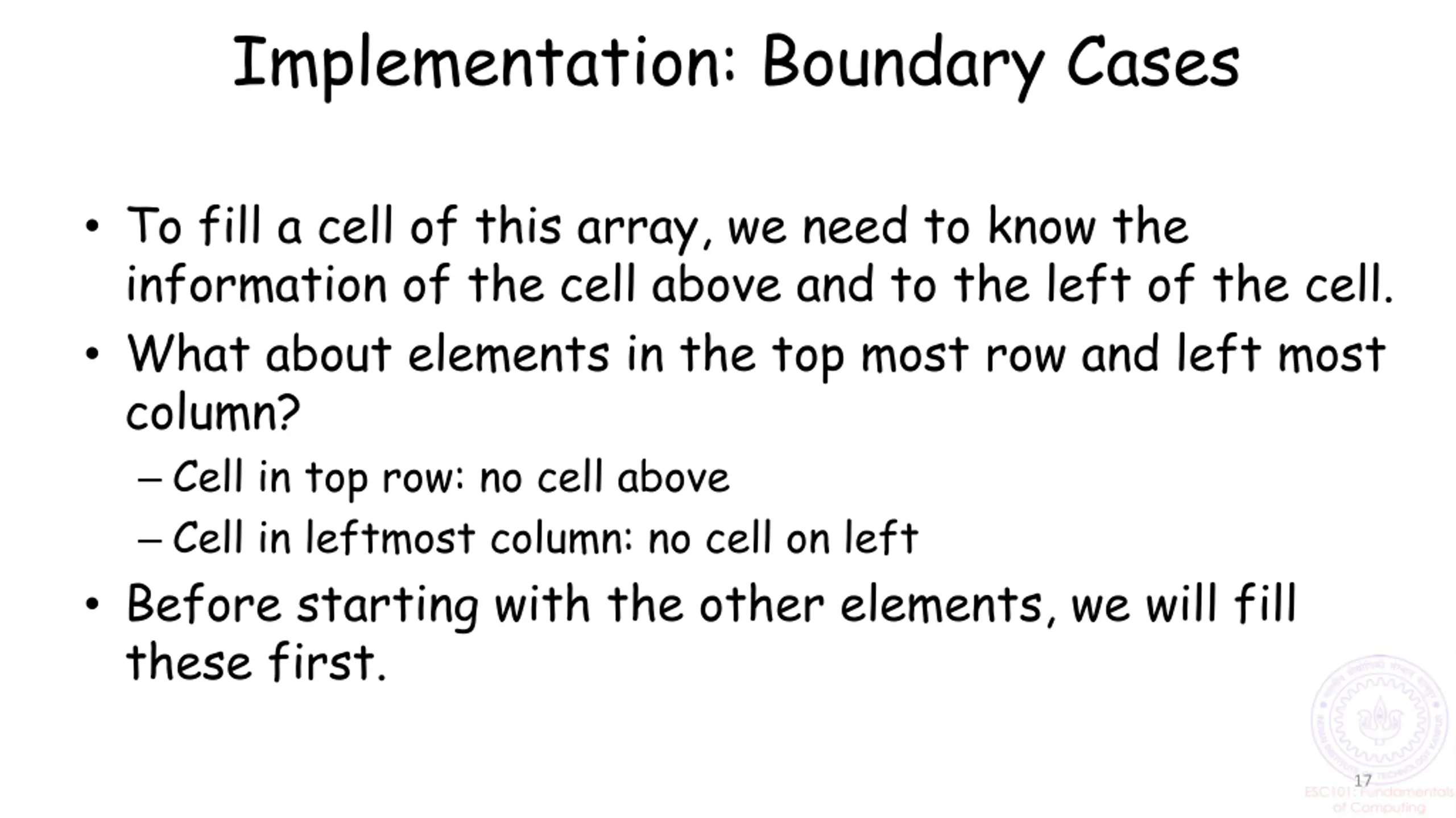 Implementation: Boundary Cases To fill a cell of this array, we need to know the information of the cell above and to the left of the cell. What about elements in the top most row and left most column? Cell in top row: no cell above Cell in leftmost column: no cell on left Before starting with the other elements, we will fill these first. 17