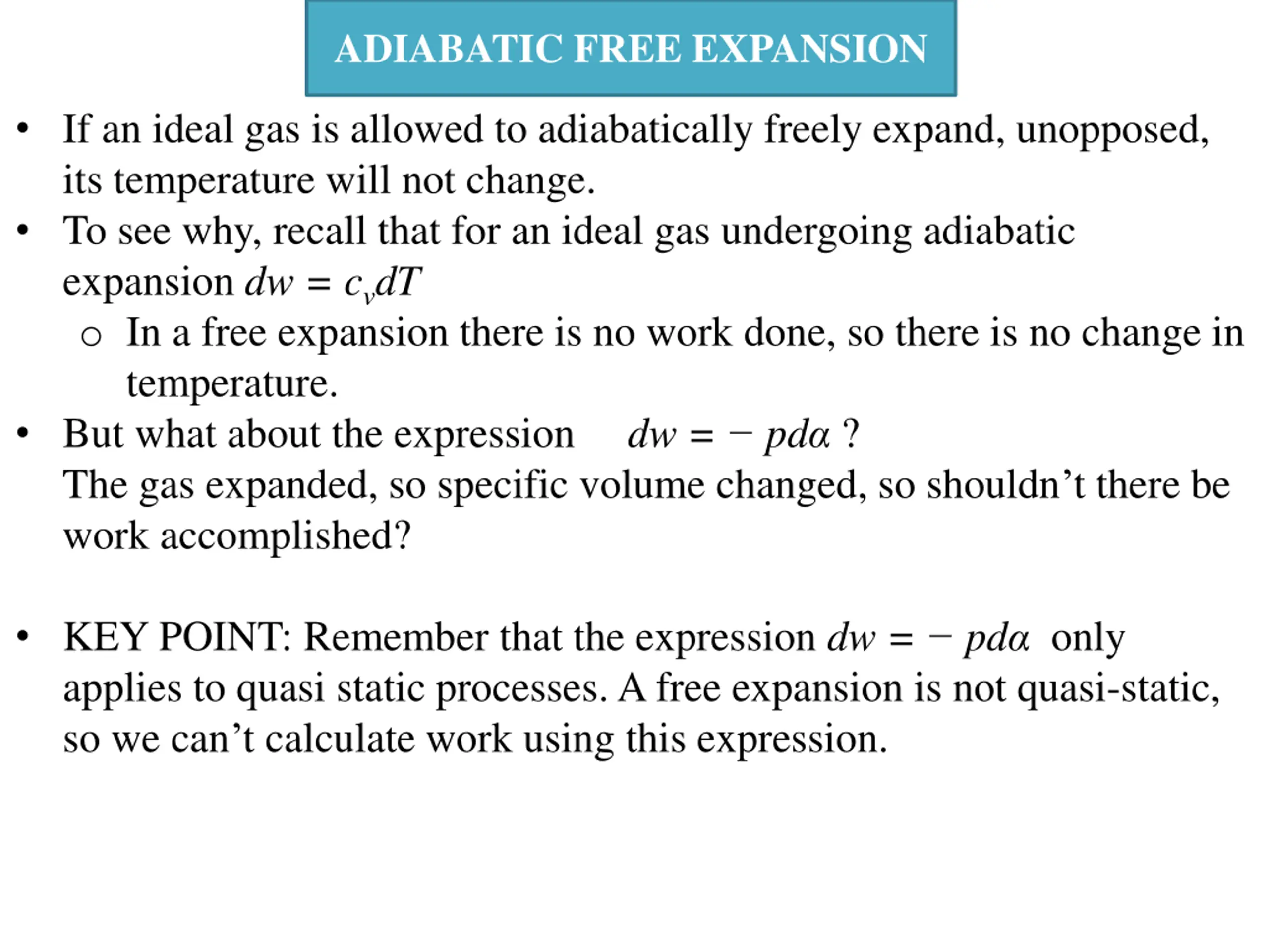 ADIABATIC FREE EXPANSION If an ideal gas is allowed to adiabatically freely expand, unopposed, its temperature will not change. To see why, recall that for an ideal gas undergoing adiabatic expansion dw = cvdT o In a free expansion there is no work done, so there is no change in temperature. But what about the expression dw = pd ? The gas expanded, so specific volume changed, so shouldn t there be work accomplished? KEY POINT: Remember that the expression dw = pd only applies to quasi static processes. A free expansion is not quasi-static, so we can t calculate work using this expression.