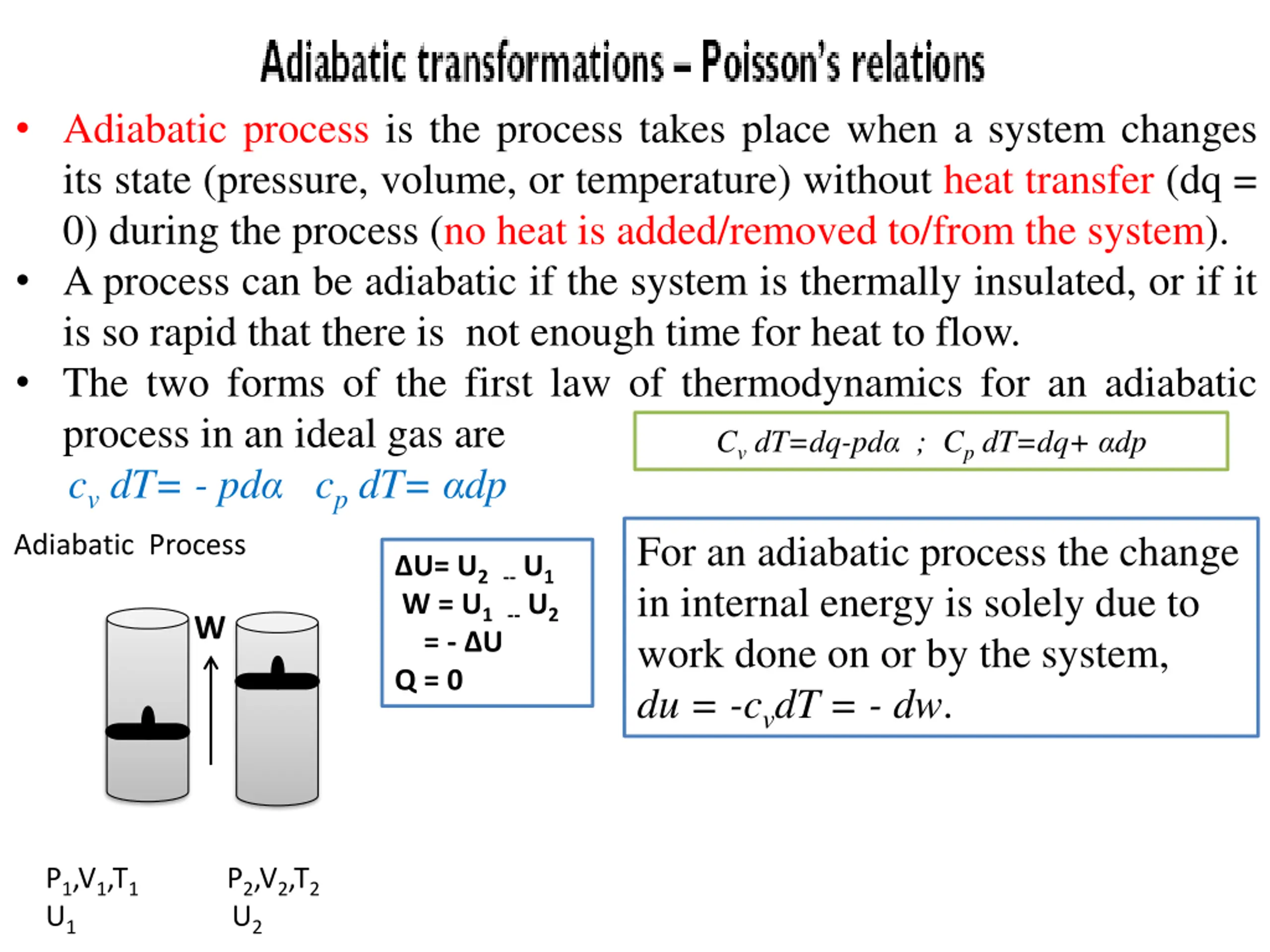 Adiabatic process is the process takes place when a system changes its state (pressure, volume, or temperature) without heat transfer (dq = 0) during the process (no heat is added/removed to/from the system). A process can be adiabatic if the system is thermally insulated, or if it is so rapid that there is not enough time for heat to flow. The two forms of the first law of thermodynamics for an adiabatic process in an ideal gas are cv dT= - pd cp dT= dp For an adiabatic process the change in internal energy is solely due to work done on or by the system, du = -cvdT = - dw. Cv dT=dq-pd ; Cp dT=dq+ dp Adiabatic Process U= U2 -- U1 W = U1 -- U2 = - U Q = 0 W P1,V1,T1 P2,V2,T2 U1 U2