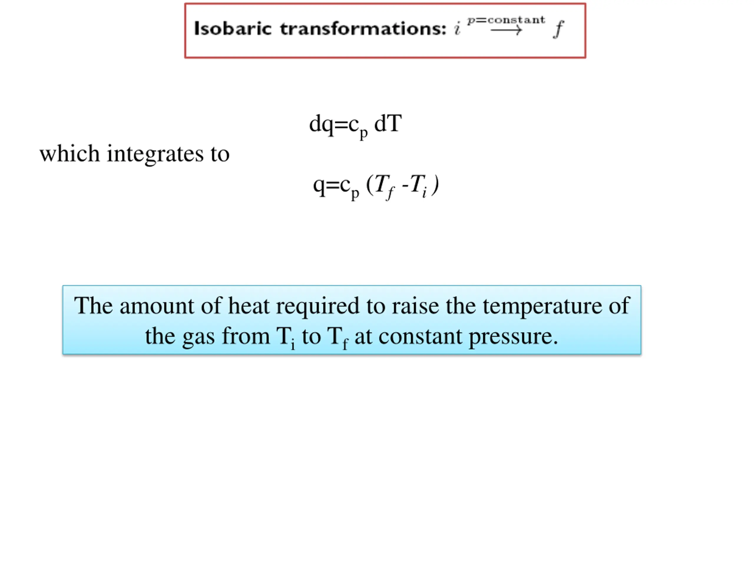 dq=cp dT which integrates to q=cp (Tf -Ti ) The amount of heat required to raise the temperature of the gas from Ti to Tf at constant pressure.