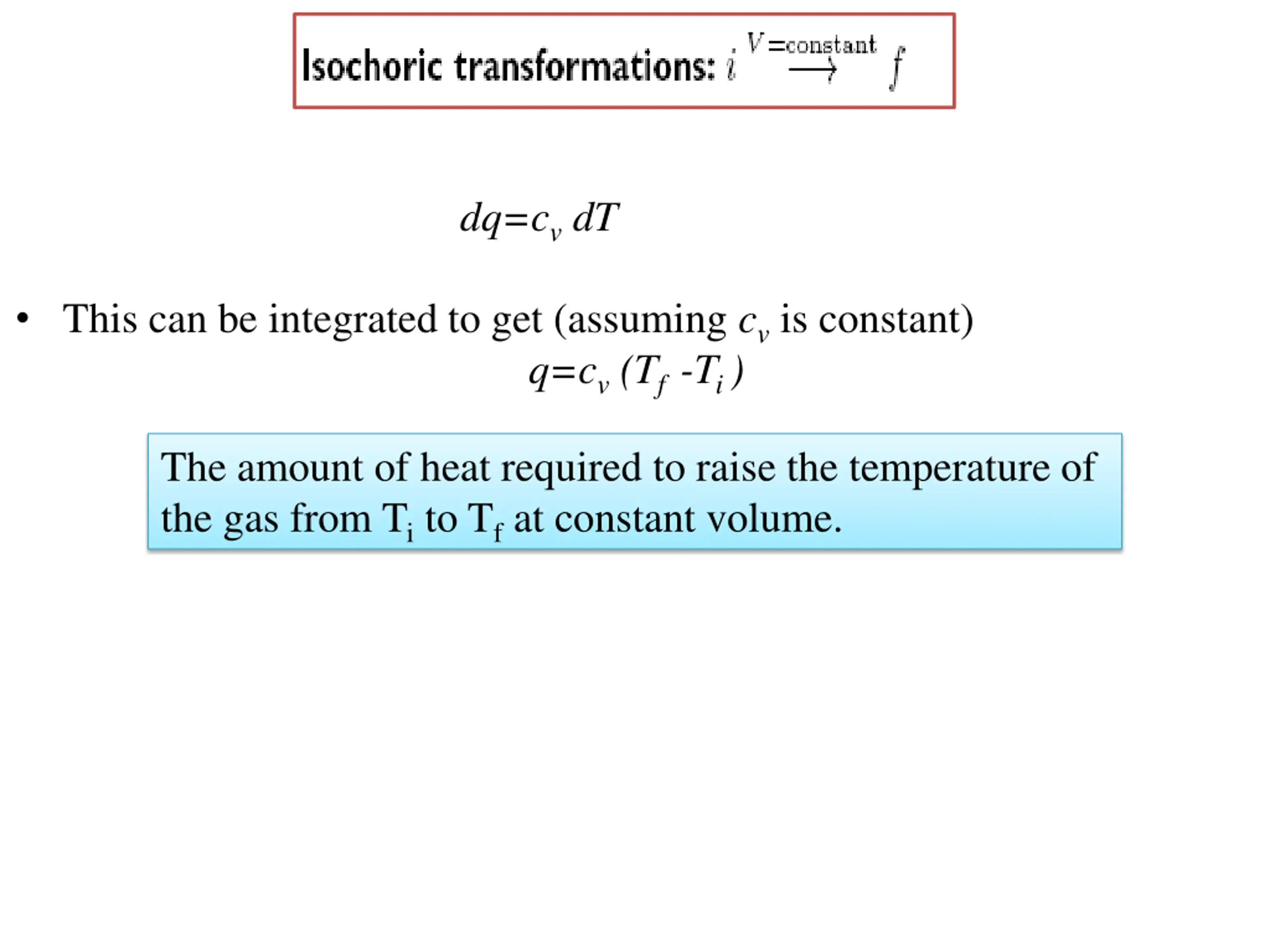 dq=cv dT This can be integrated to get (assuming cv is constant) q=cv (Tf -Ti ) The amount of heat required to raise the temperature of the gas from Ti to Tf at constant volume.