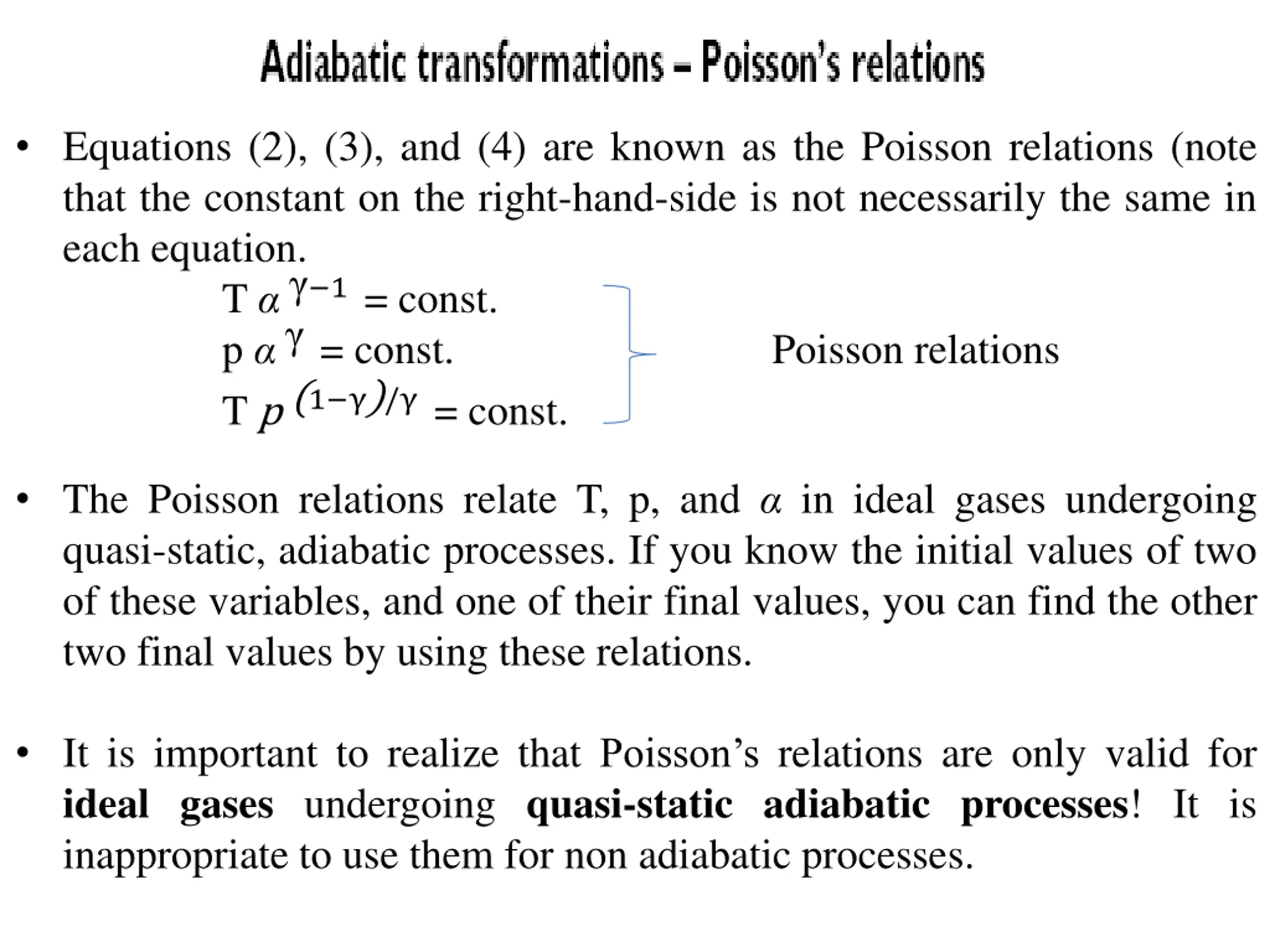 Equations (2), (3), and (4) are known as the Poisson relations (note that the constant on the right-hand-side is not necessarily the same in each equation. T 1= const. p = const. Poisson relations T p (1 )/ = const. The Poisson relations relate T, p, and in ideal gases undergoing quasi-static, adiabatic processes. If you know the initial values of two of these variables, and one of their final values, you can find the other two final values by using these relations. It is important to realize that Poisson s relations are only valid for ideal gases undergoing quasi-static adiabatic processes! It is inappropriate to use them for non adiabatic processes.
