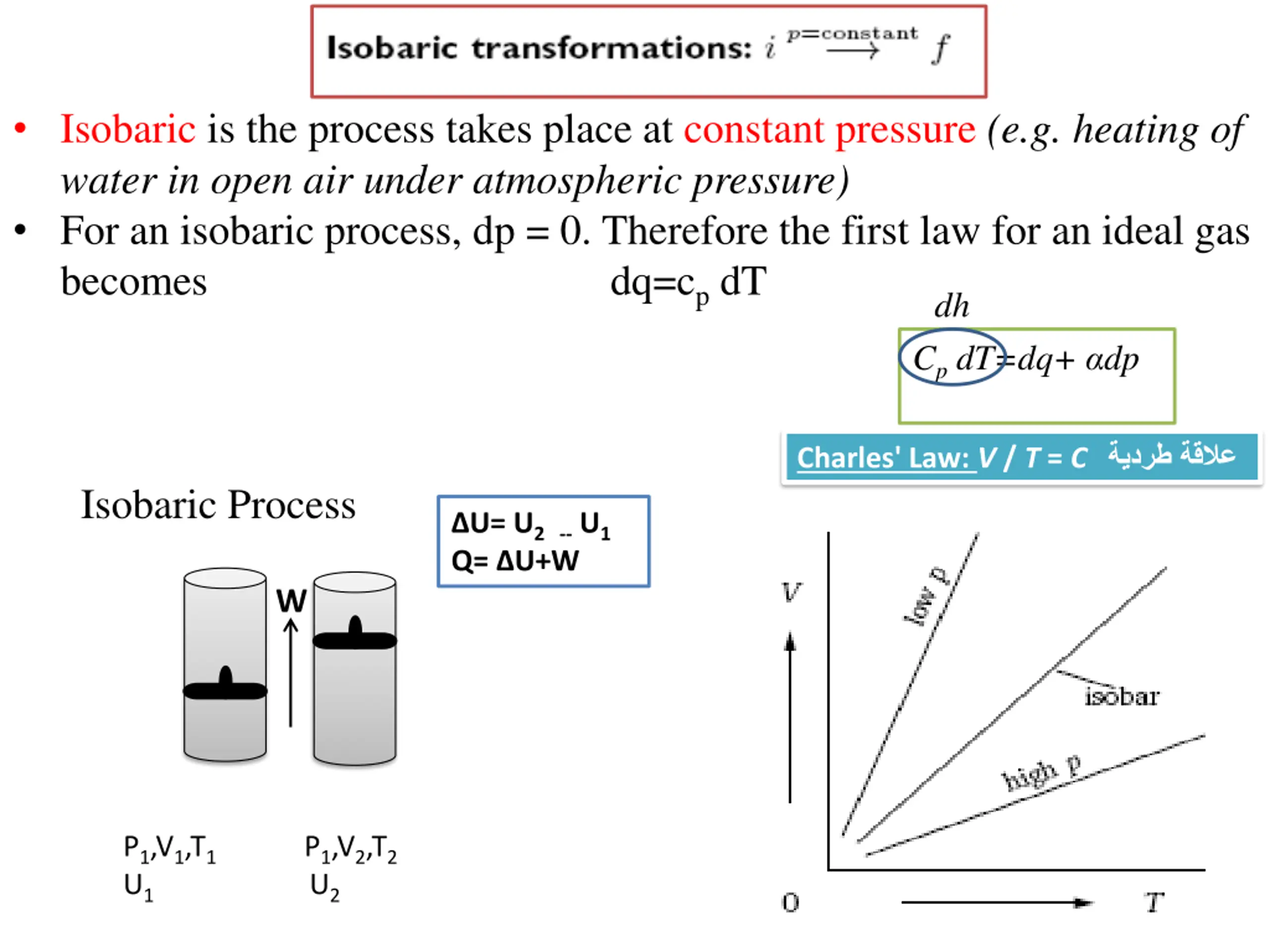 Isobaric is the process takes place at constant pressure (e.g. heating of water in open air under atmospheric pressure) For an isobaric process, dp = 0. Therefore the first law for an ideal gas becomes dq=cp dT dh Cp dT=dq+ dp Charles' Law: V / T = C Isobaric Process U= U2 -- U1 Q= U+W W P1,V1,T1 P1,V2,T2 U1 U2