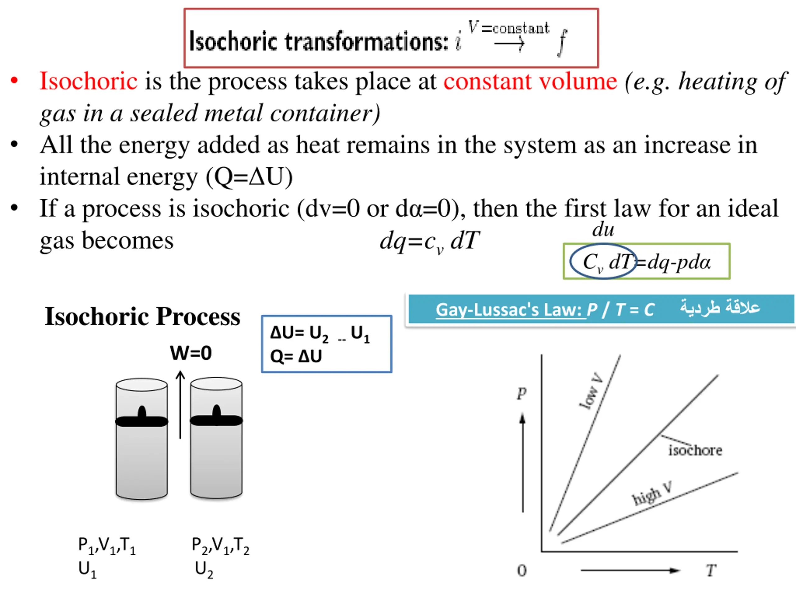 Isochoric is the process takes place at constant volume (e.g. heating of gas in a sealed metal container) All the energy added as heat remains in the system as an increase in internal energy (Q= U) If a process is isochoric (dv=0 or d =0), then the first law for an ideal gas becomes dq=cv dT du Cv dT=dq-pd Gay-Lussac's Law: P / T = C Isochoric Process U= U2 -- U1 Q= U W=0 P1,V1,T1 P2,V1,T2 U1 U2