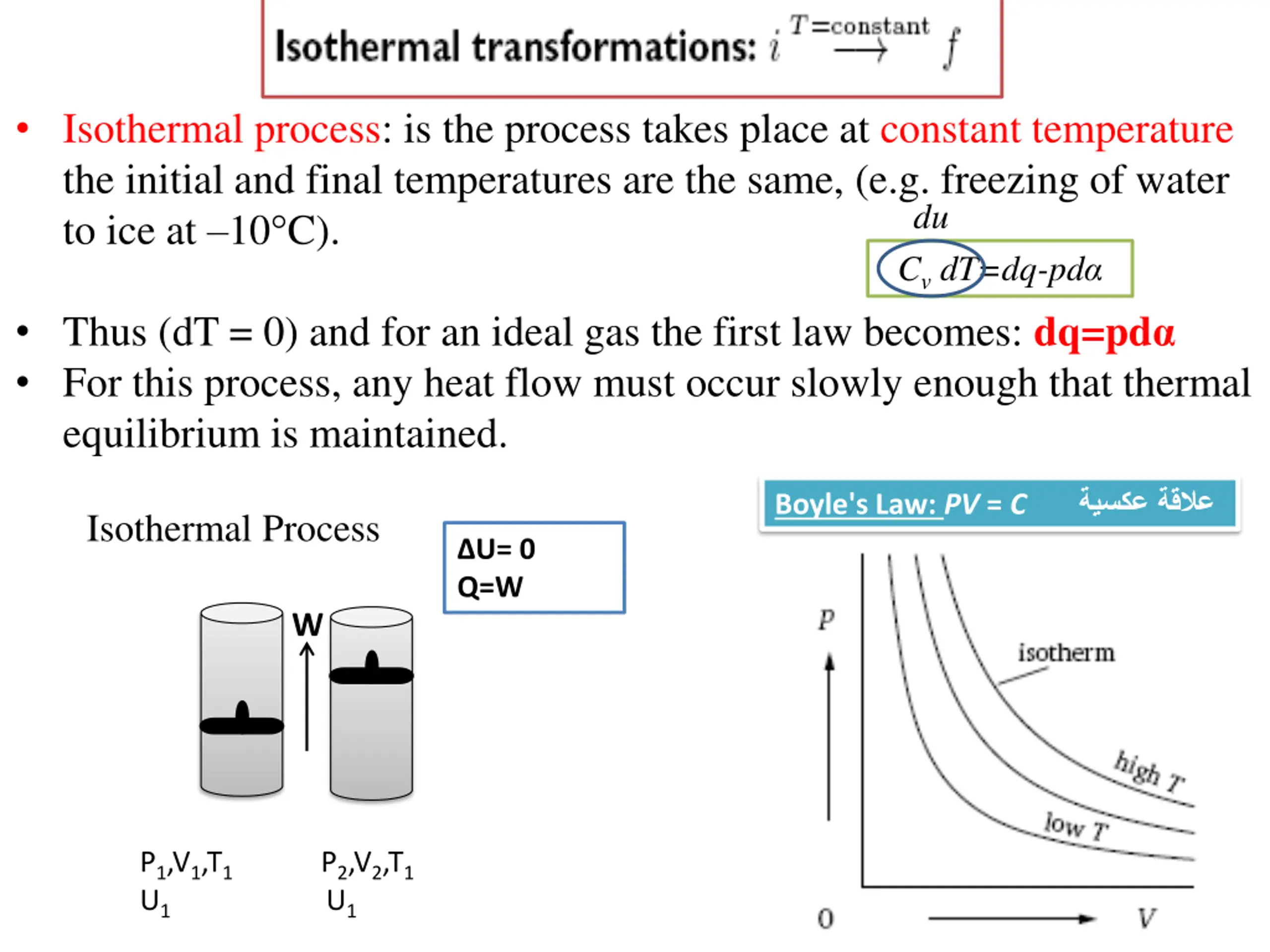 Isothermal process: is the process takes place at constant temperature the initial and final temperatures are the same, (e.g. freezing of water to ice at 10 C). du Cv dT=dq-pd Thus (dT = 0) and for an ideal gas the first law becomes: dq=pd For this process, any heat flow must occur slowly enough that thermal equilibrium is maintained. Boyle's Law: PV = C Isothermal Process U= 0 Q=W W P1,V1,T1 P2,V2,T1 U1 U1