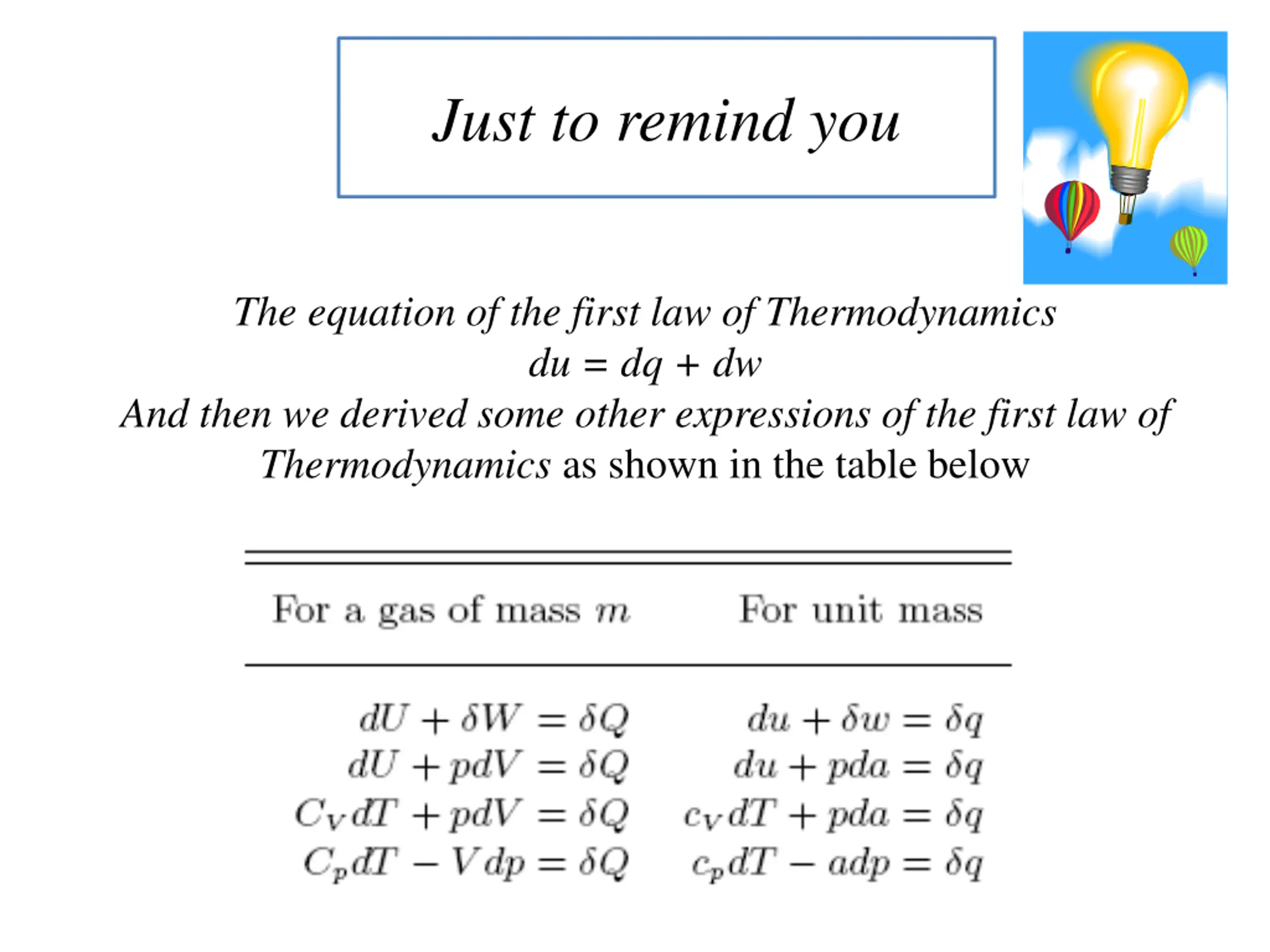 Just to remind you The equation of the first law of Thermodynamics du = dq + dw And then we derived some other expressions of the first law of Thermodynamics as shown in the table below