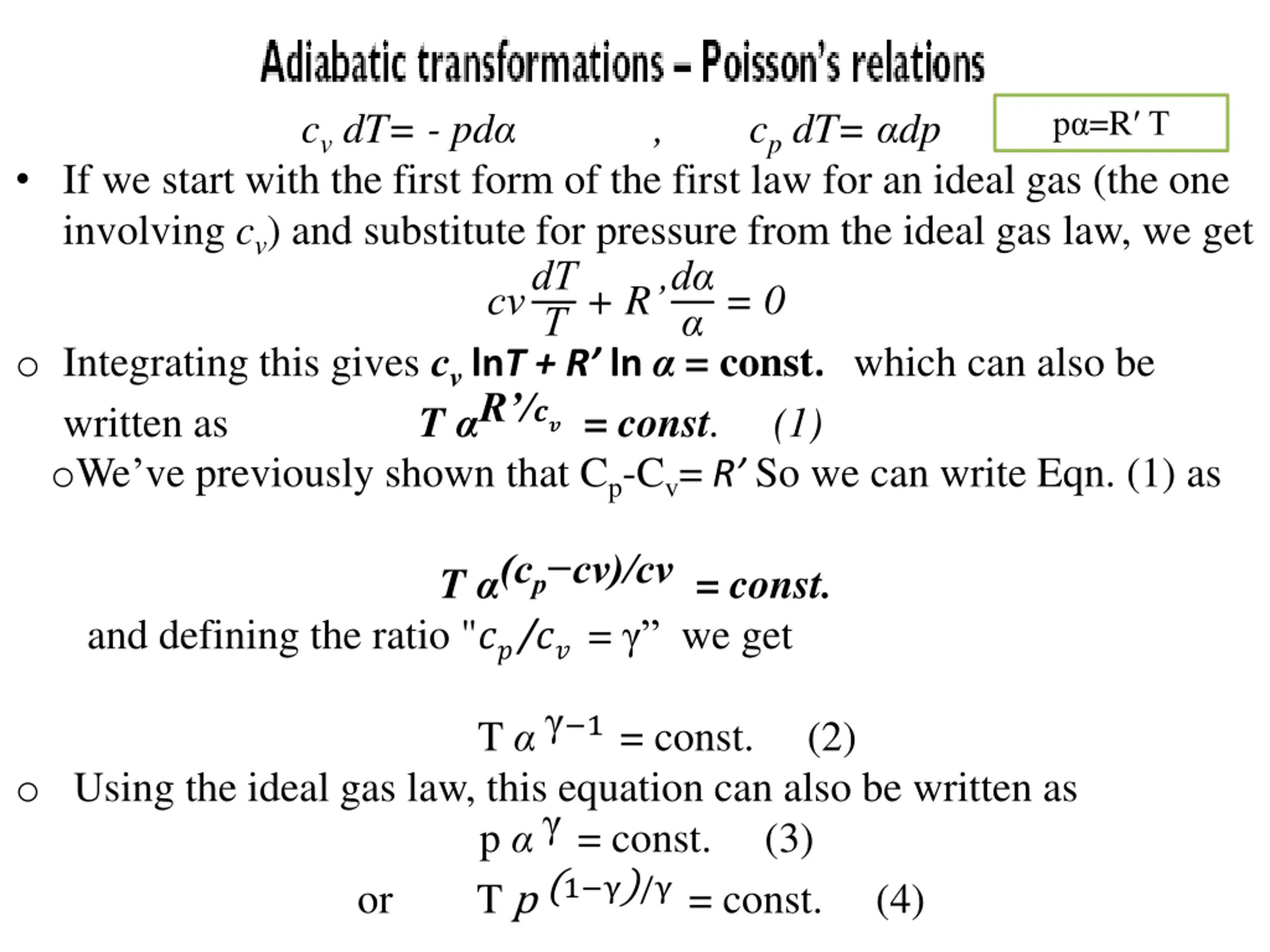 p=R T cv dT= - pd , cp dT= dp If we start with the first form of the first law for an ideal gas (the one involving cv) and substitute for pressure from the ideal gas law, we get cvdT o Integrating this gives cvlnT + R ln = const. which can also be written as T R /?? = const. (1) oWe ve previously shown that Cp-Cv=R So we can write Eqn. (1) as T+ R d = 0 T (cp cv)/cv = const. and defining the ratio "?? /?? = we get T 1= const. (2) o Using the ideal gas law, this equation can also be written as p = const. (3) or T p (1 )/ = const. (4)