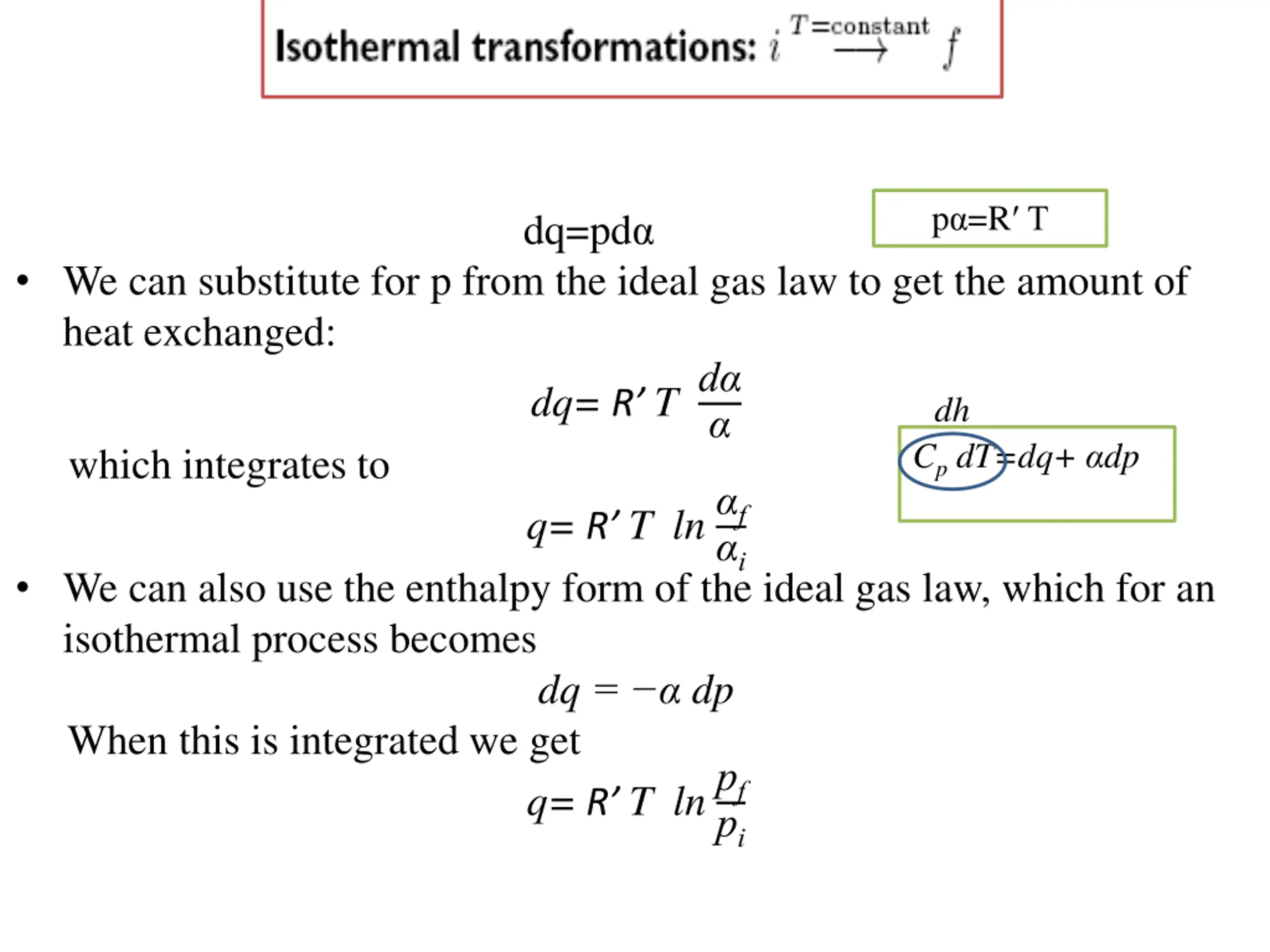 p=R T dq=pd We can substitute for p from the ideal gas law to get the amount of heat exchanged: dq=R T d which integrates to q=R T ln f We can also use the enthalpy form of the ideal gas law, which for an isothermal process becomes dq = dp When this is integrated we get q=R T lnpf dh Cp dT=dq+ dp i pi
