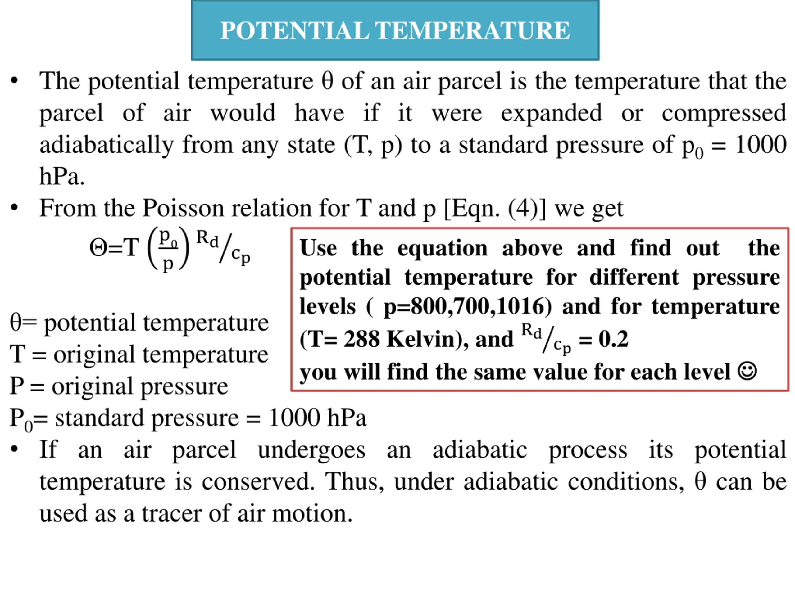 POTENTIAL TEMPERATURE The potential temperature of an air parcel is the temperature that the parcel of air would have if it were expanded or compressed adiabatically from any state (T, p) to a standard pressure of p0 = 1000 hPa. From the Poisson relation for T and p [Eqn. (4)] we get =T p potential temperature for different pressure levels ( p=800,700,1016) and for temperature (T= 288 Kelvin), and you will find the same value for each level p0 Rdcp Use the equation above and find out the = potential temperature T = original temperature P = original pressure P0= standard pressure = 1000 hPa If an air parcel undergoes an adiabatic process its potential temperature is conserved. Thus, under adiabatic conditions, can be used as a tracer of air motion. Rdcp = 0.2