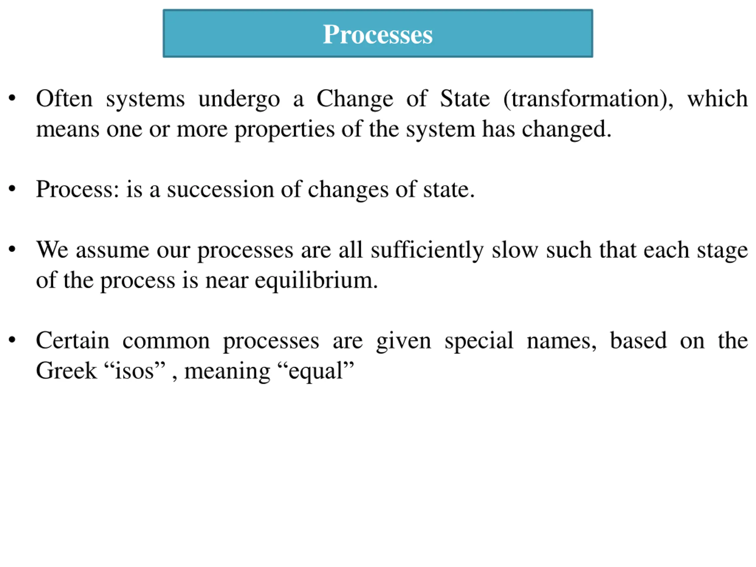 Processes Often systems undergo a Change of State (transformation), which means one or more properties of the system has changed. Process: is a succession of changes of state. We assume our processes are all sufficiently slow such that each stage of the process is near equilibrium. Certain common processes are given special names, based on the Greek isos , meaning equal