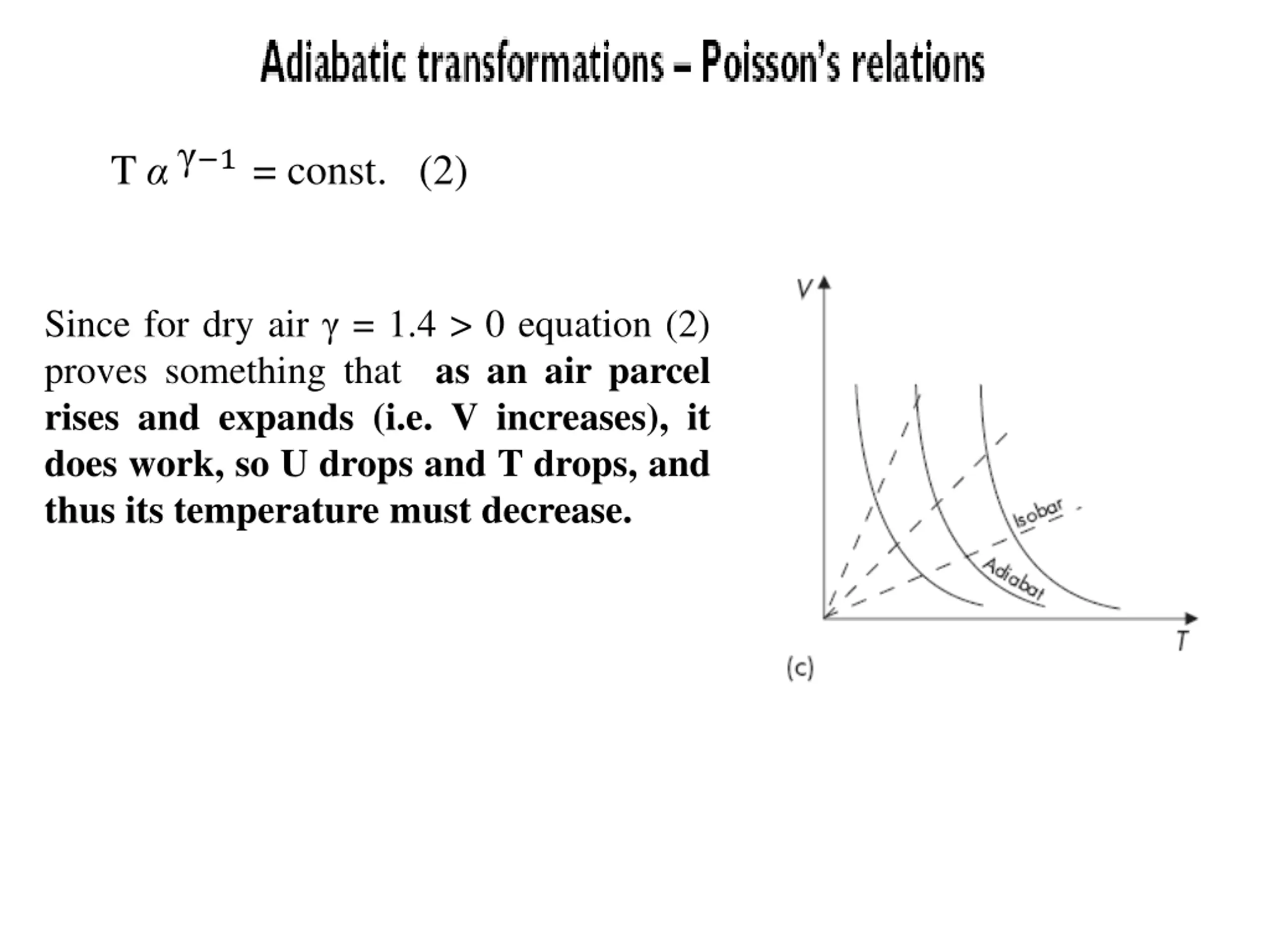T 1= const. (2) Since for dry air = 1.4 > 0 equation (2) proves something that as an air parcel rises and expands (i.e. V increases), it does work, so U drops and T drops, and thus its temperature must decrease.