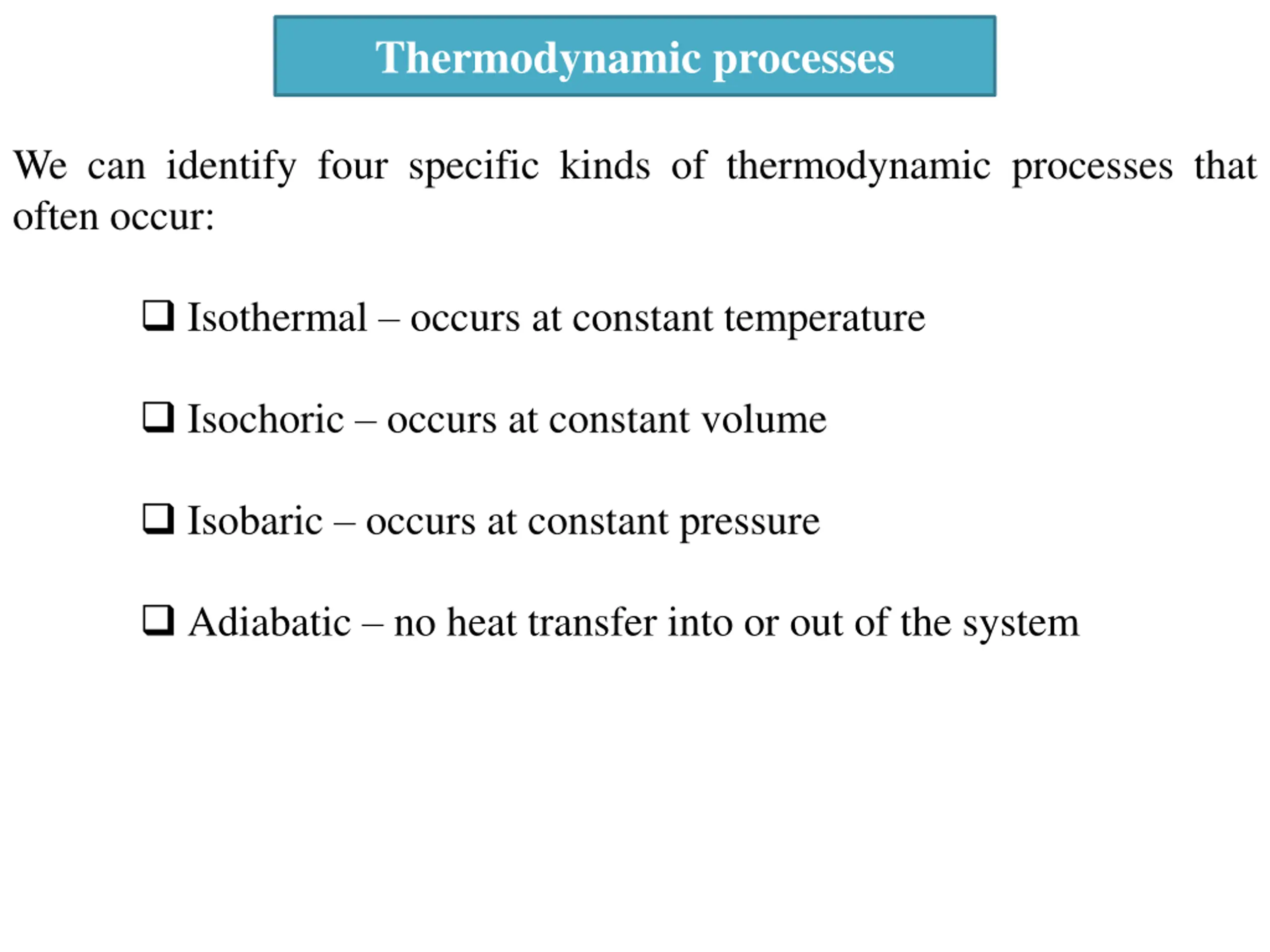 Thermodynamic processes We can identify four specific kinds of thermodynamic processes that often occur: Isothermal occurs at constant temperature Isochoric occurs at constant volume Isobaric occurs at constant pressure Adiabatic no heat transfer into or out of the system