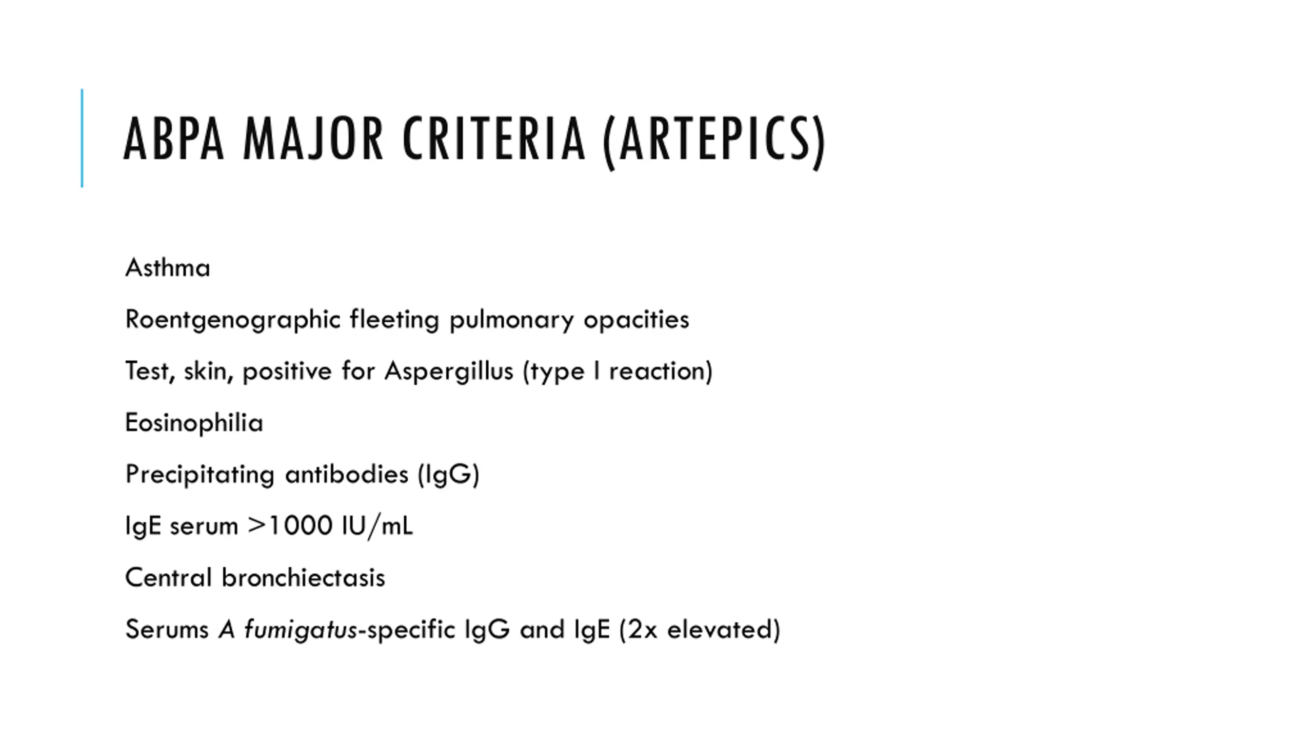 ABPA MAJOR CRITERIA (ARTEPICS) Asthma Roentgenographic fleeting pulmonary opacities Test, skin, positive for Aspergillus (type I reaction) Eosinophilia Precipitating antibodies (IgG) IgE serum >1000 IU/mL Central bronchiectasis Serums A fumigatus-specific IgG and IgE (2x elevated)