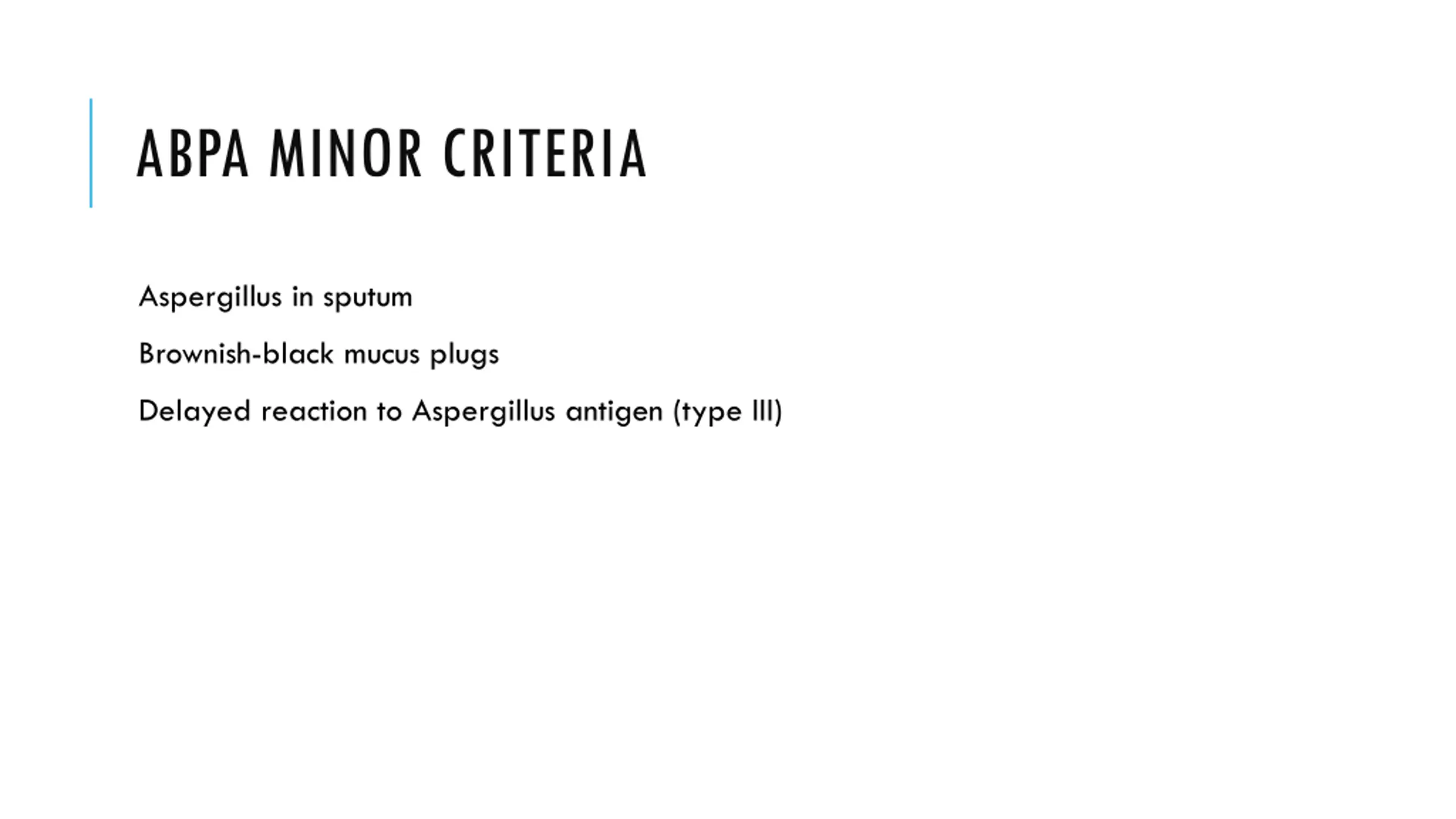 ABPA MINOR CRITERIA Aspergillus in sputum Brownish-black mucus plugs Delayed reaction to Aspergillus antigen (type III)