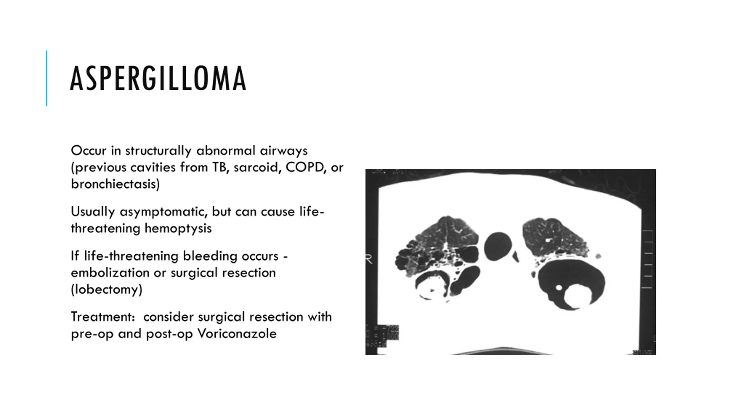 ASPERGILLOMA Occur in structurally abnormal airways (previous cavities from TB, sarcoid, COPD, or bronchiectasis) Usually asymptomatic, but can cause life- threatening hemoptysis If life-threatening bleeding occurs - embolization or surgical resection (lobectomy) Treatment: consider surgical resection with pre-op and post-op Voriconazole