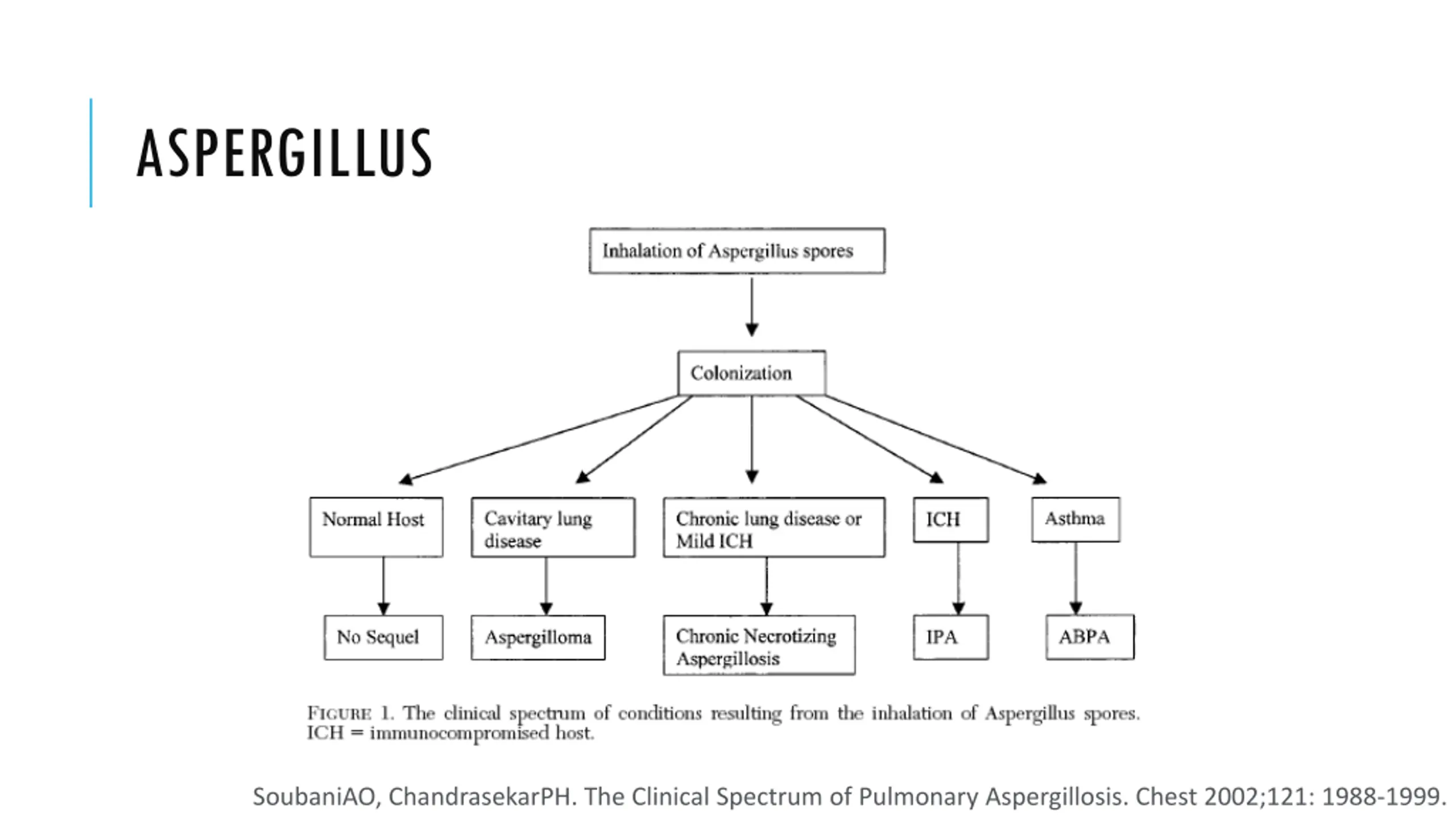 ASPERGILLUS SoubaniAO, ChandrasekarPH. The Clinical Spectrum of Pulmonary Aspergillosis. Chest 2002;121: 1988-1999.